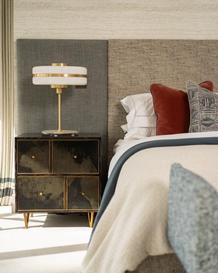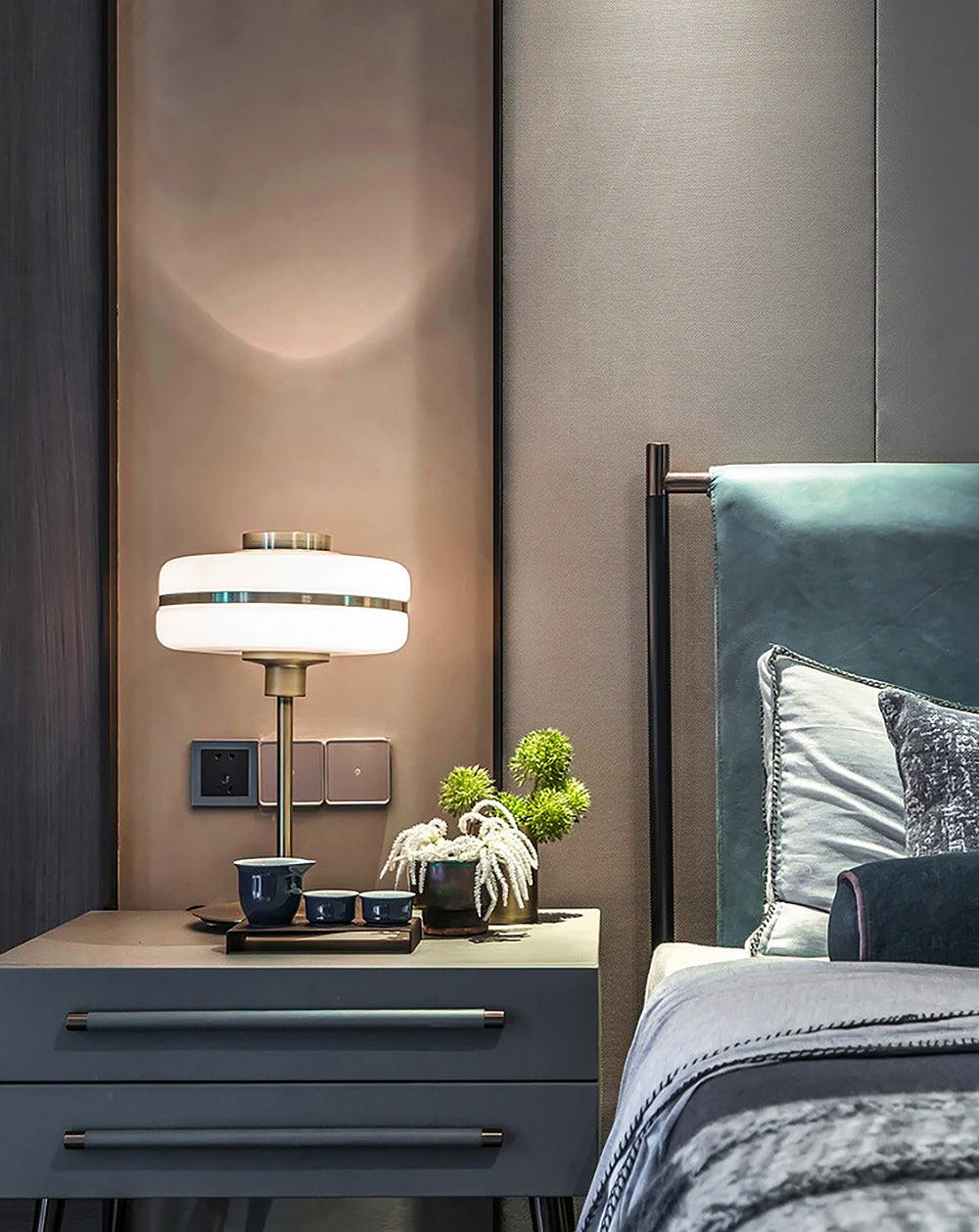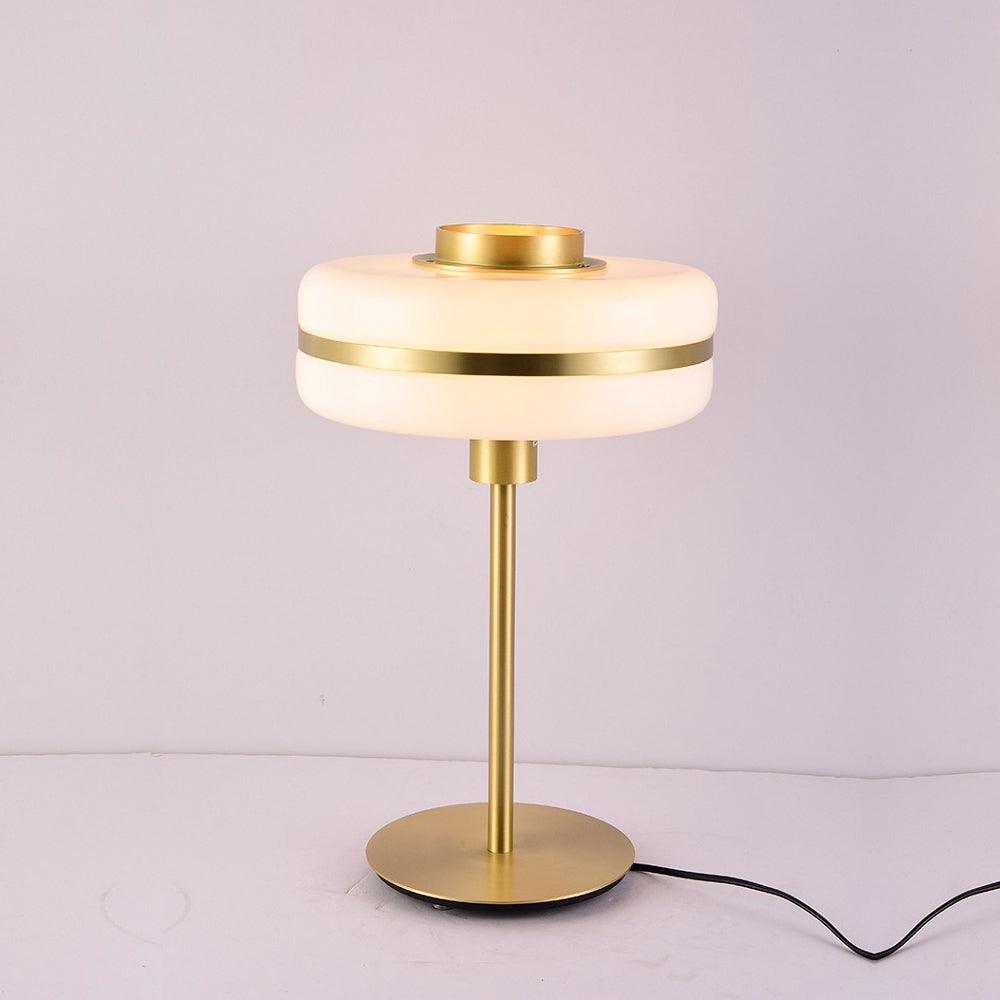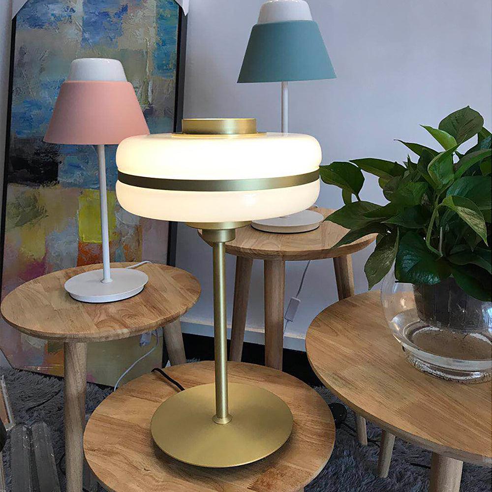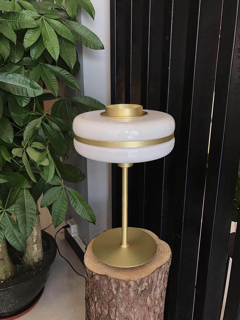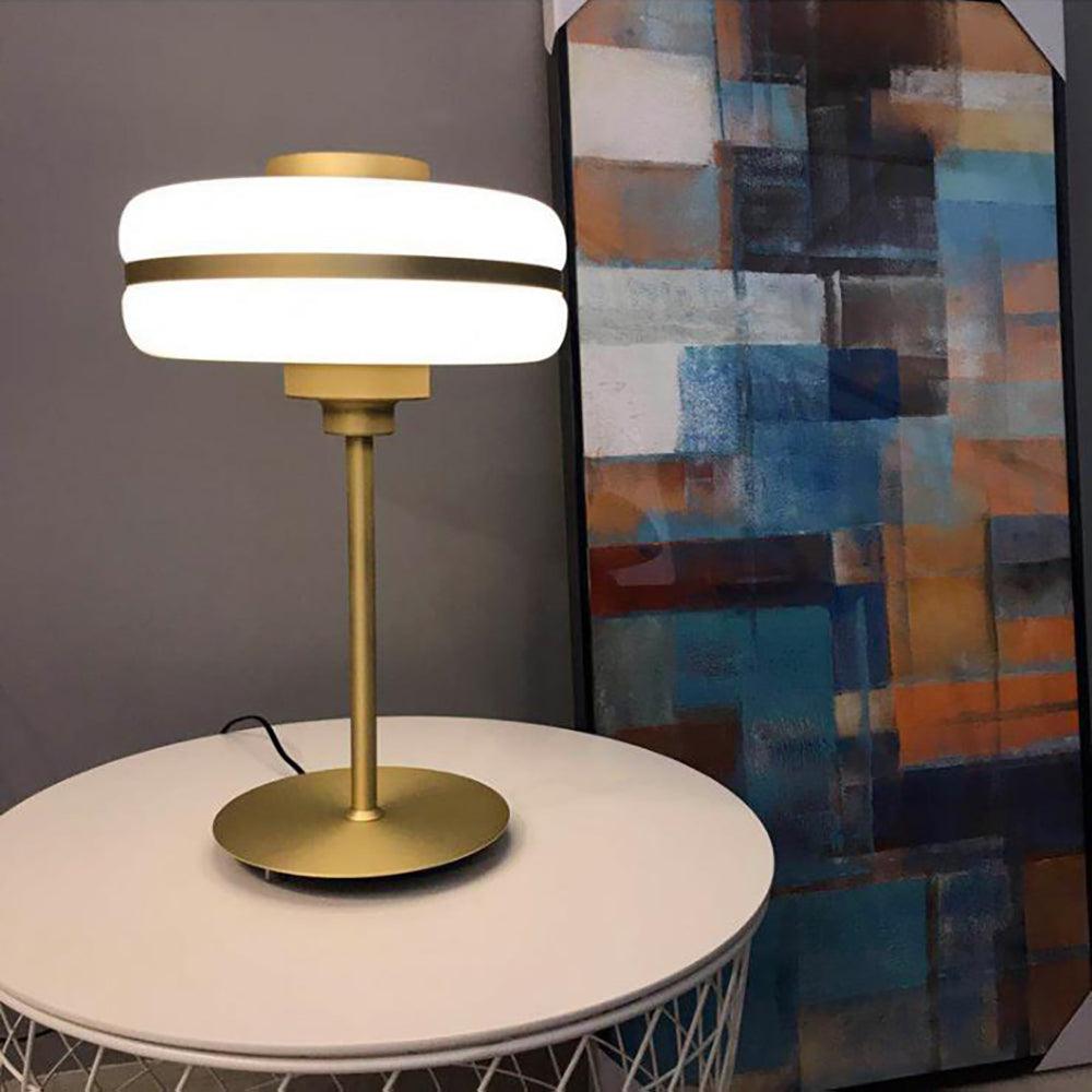 這盞燈有一個圓柱形的乳白色玻璃燈罩,點亮時會發出柔和溫暖的光芒。屏幕周圍是一條黃銅條,成為一個美麗的細節,並與相同材料的桿相匹配。白色牛奶玻璃擴散器很舒服。