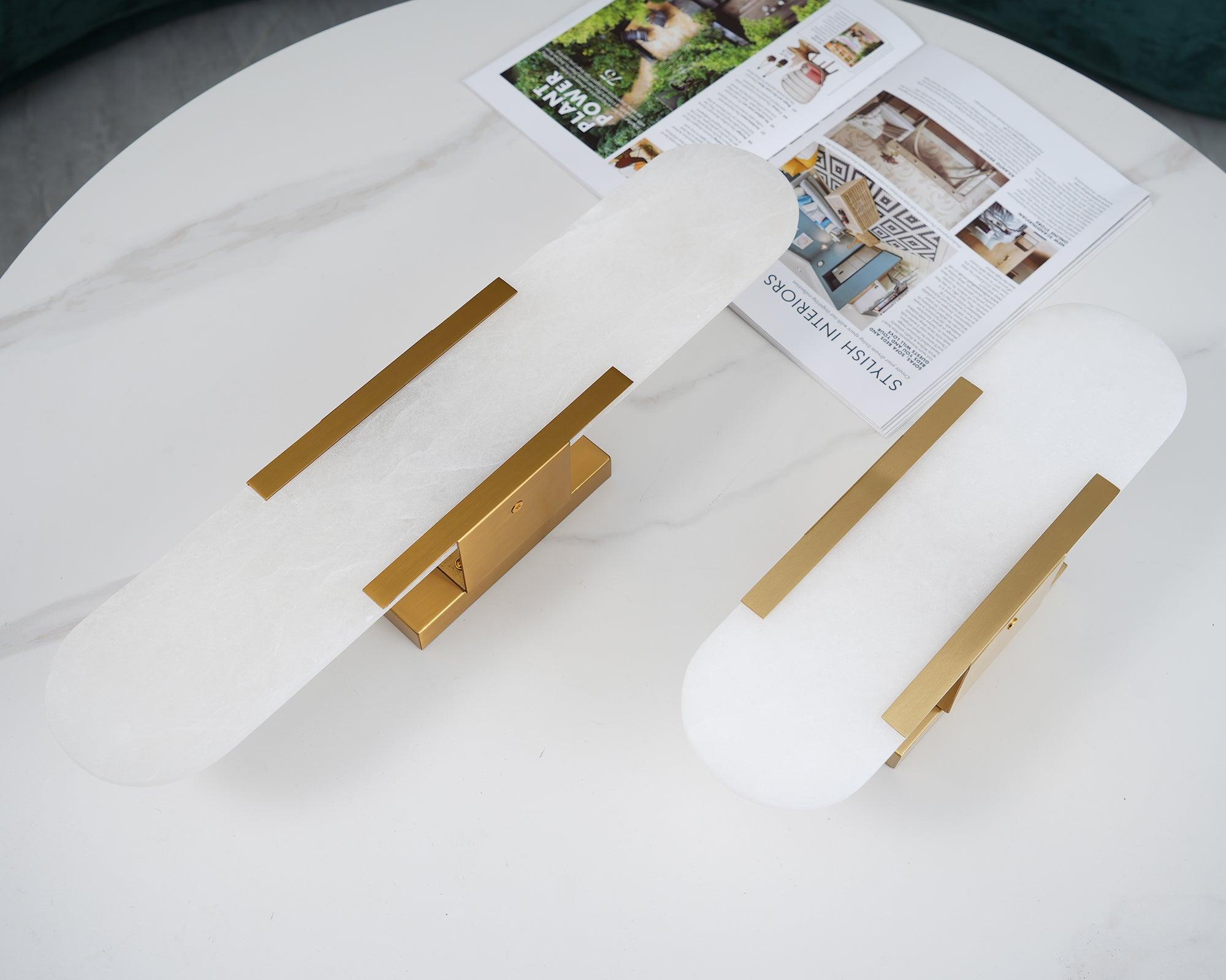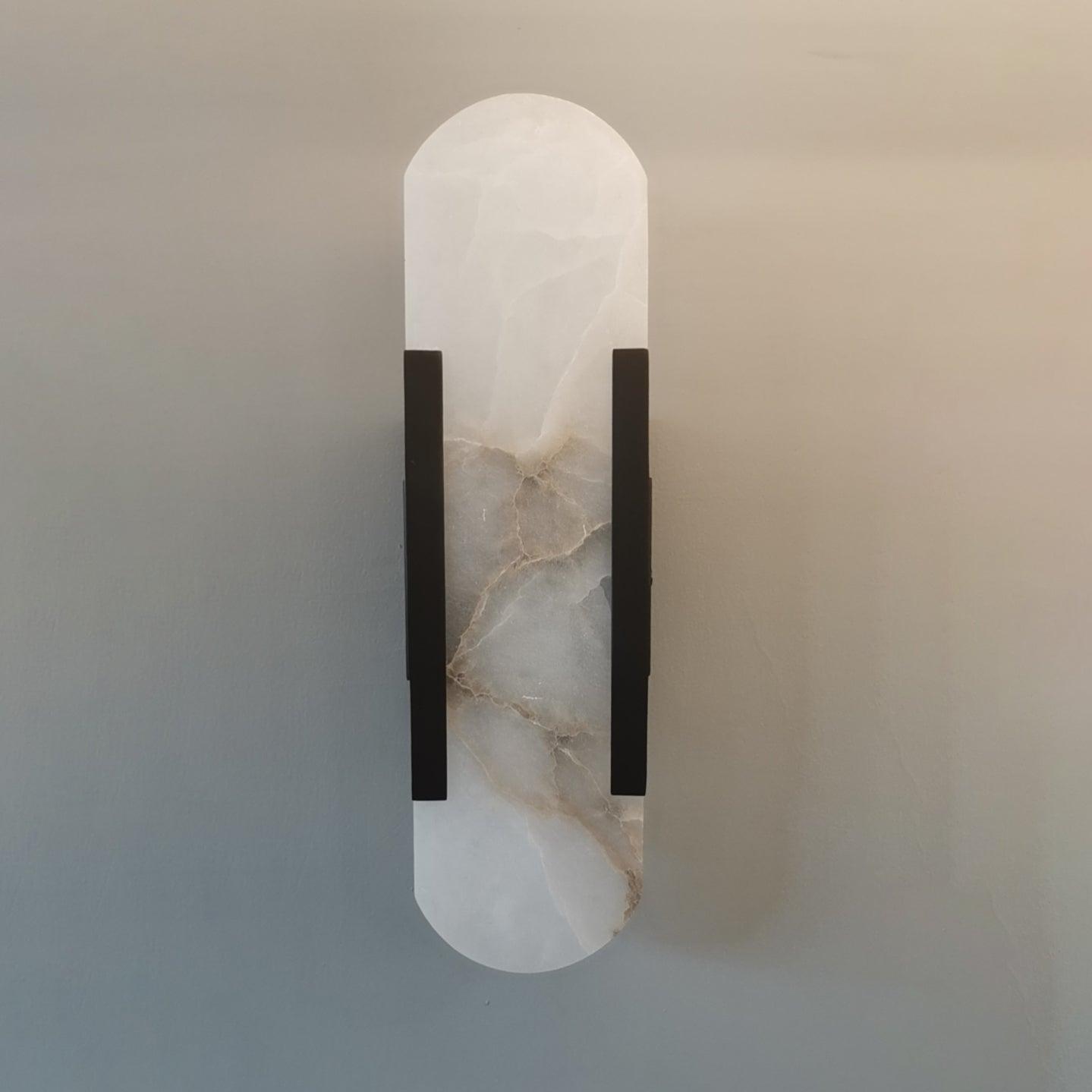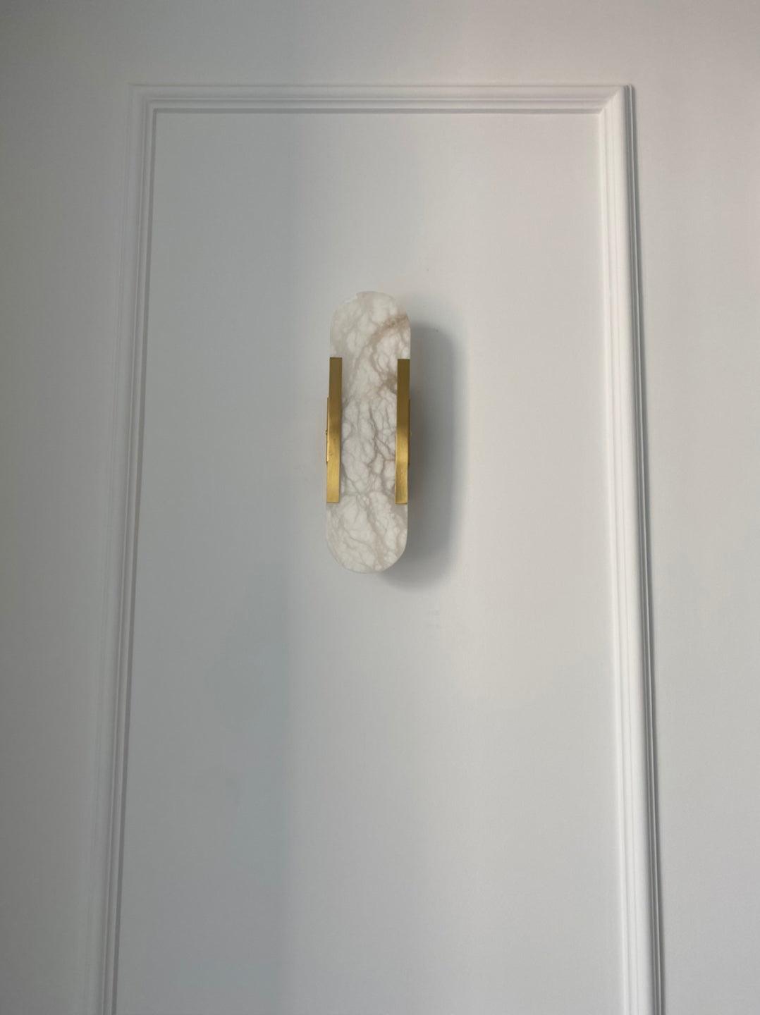 Melange Elongated Sconce 以流線型幾何形式毫不費力地將天然雪花石膏和光滑的金屬細節搭配在一起,散發出現代精緻的氣息,同時強調天然石材的美感。這款壁燈採用手工雕刻的天然雪花石膏和黃銅細節。