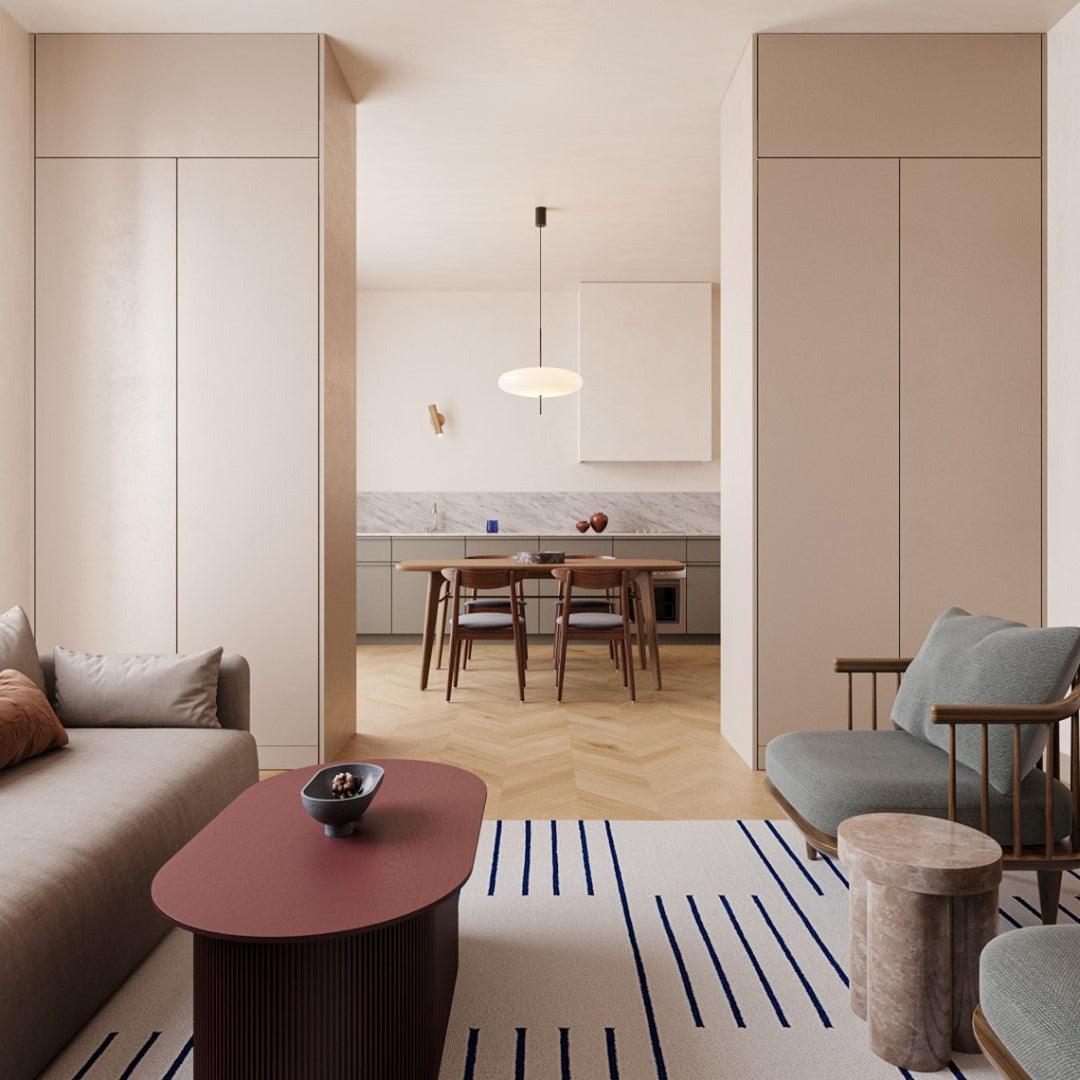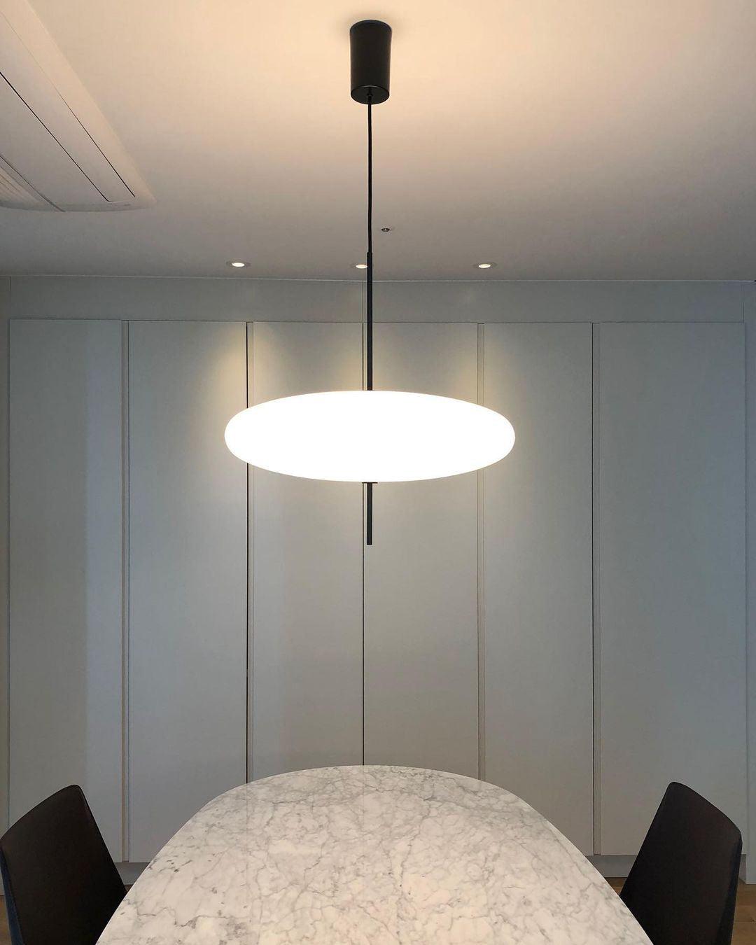 2065 型由一個擴散器組成,該擴散器由兩個連接在一起的乳白色碟子組成,懸掛在天花板上,帶有黑色塗漆的鋁製頂篷。設計師橢圓形設計的簡單性和材料的輕盈性造就了看似失重的燈具。