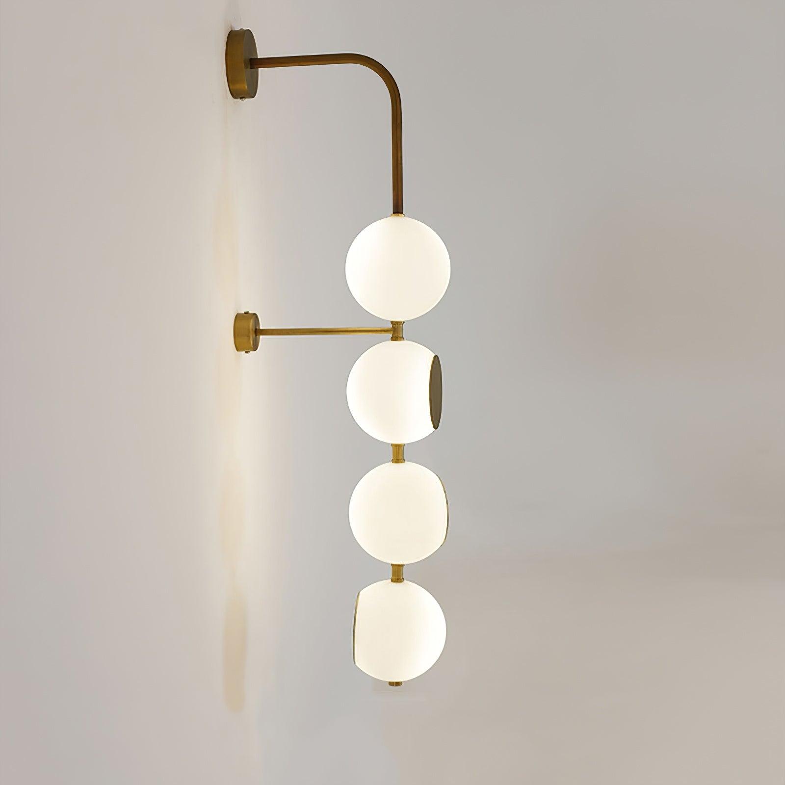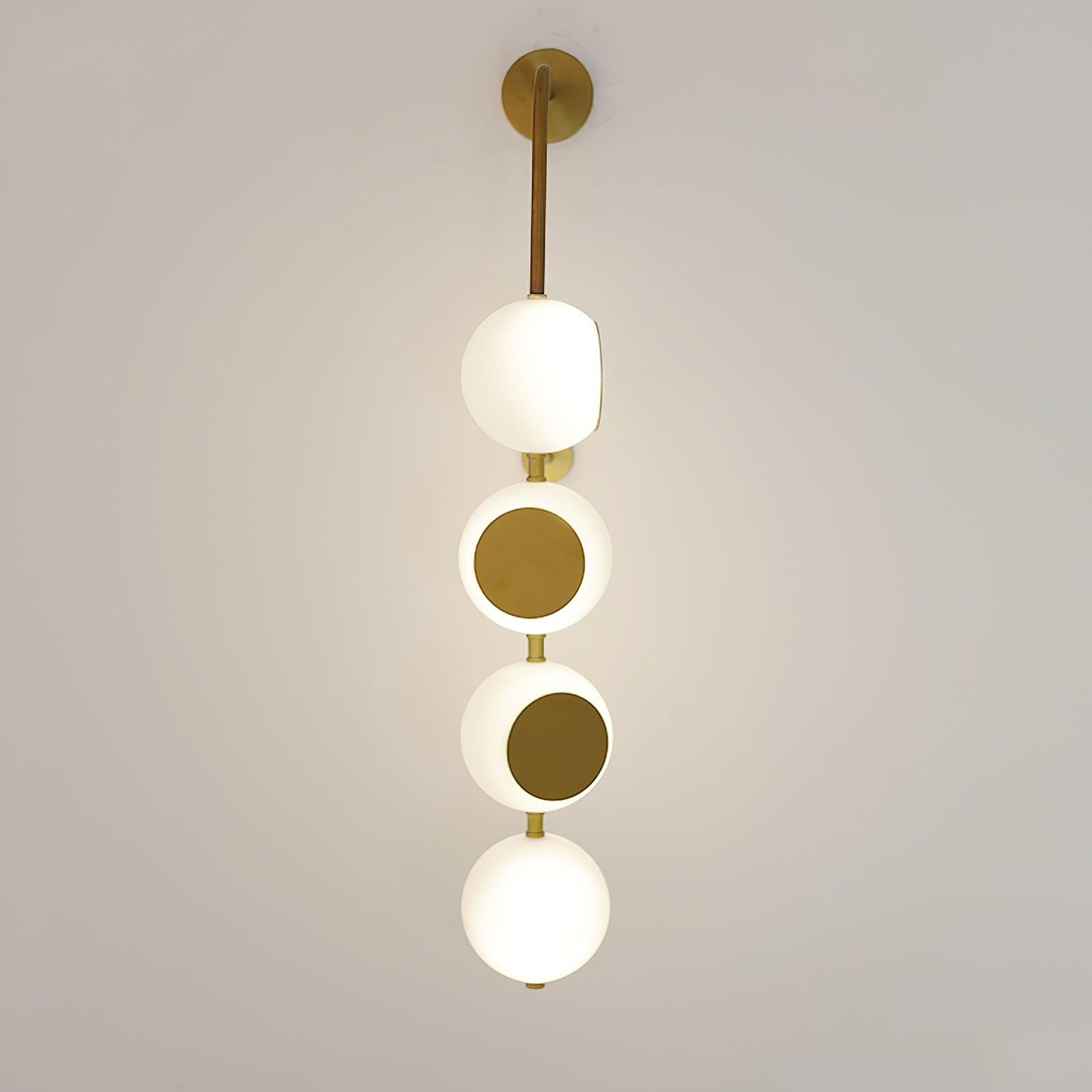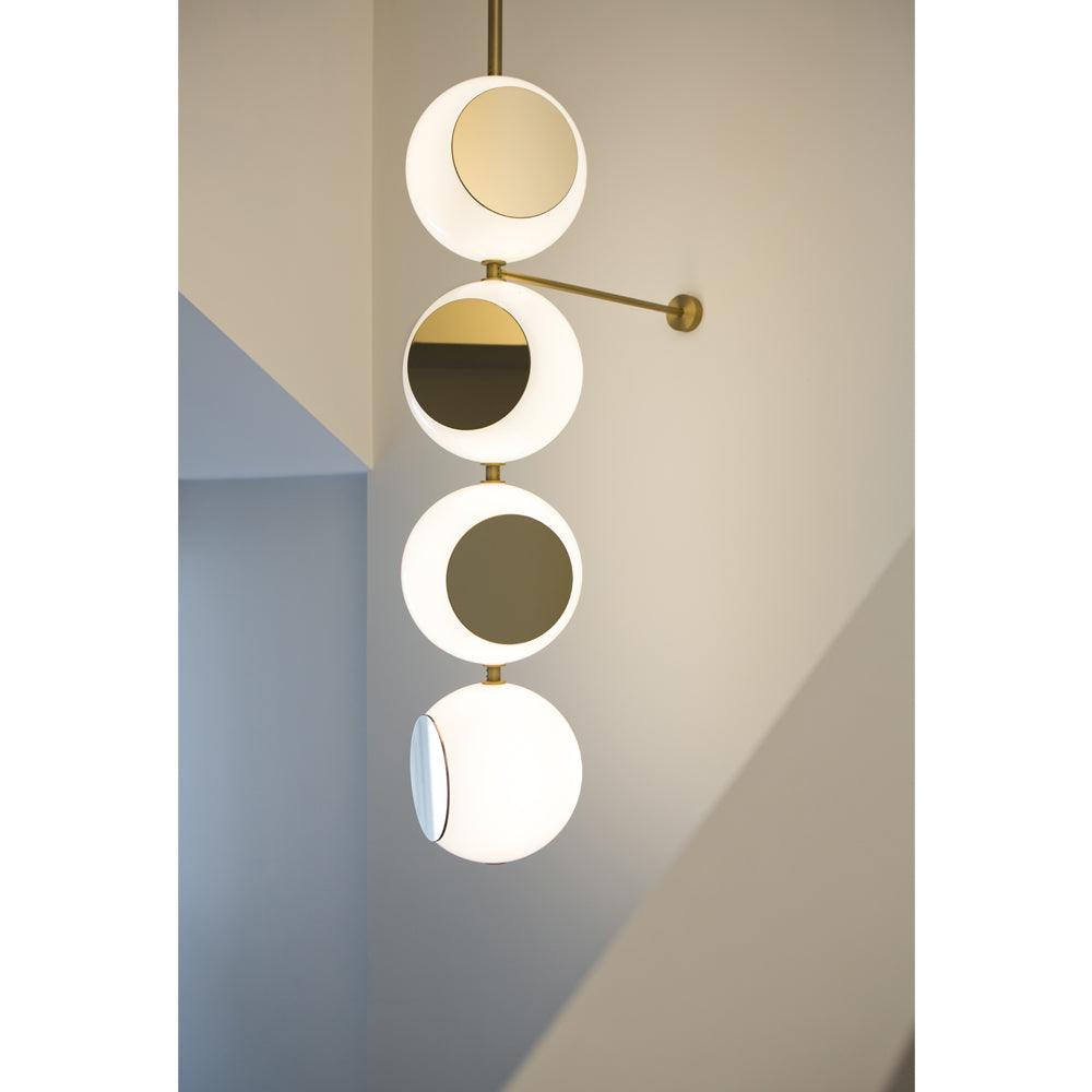 就像一條破碎的珍珠項鍊,輕元素在精心策劃的集群中流下,讓空間所需的光袋。為了增加額外的物理和概念深度,我切掉了一部分玻璃燈罩並添加了一個高度拋光的金色鏡面圓盤。