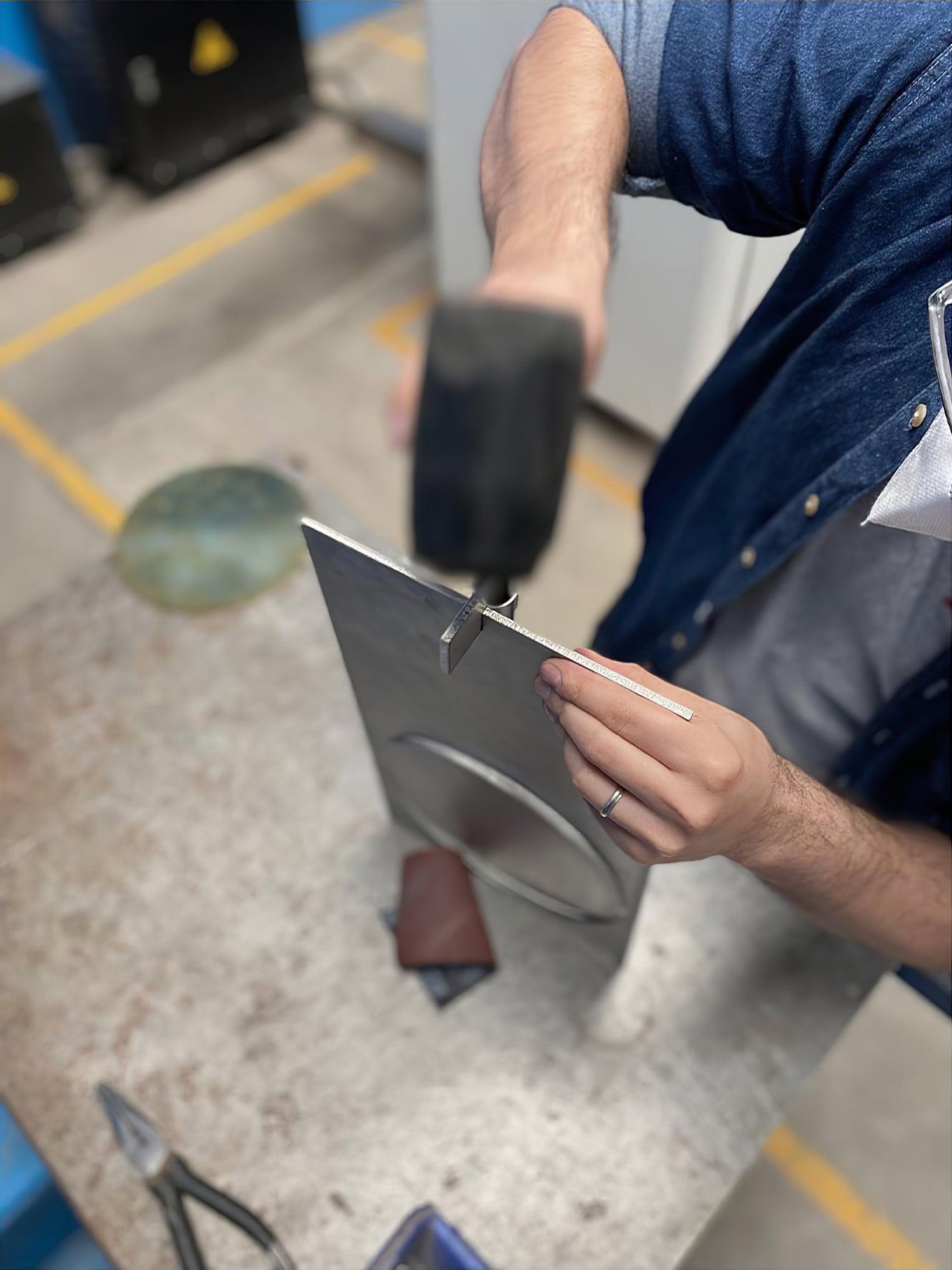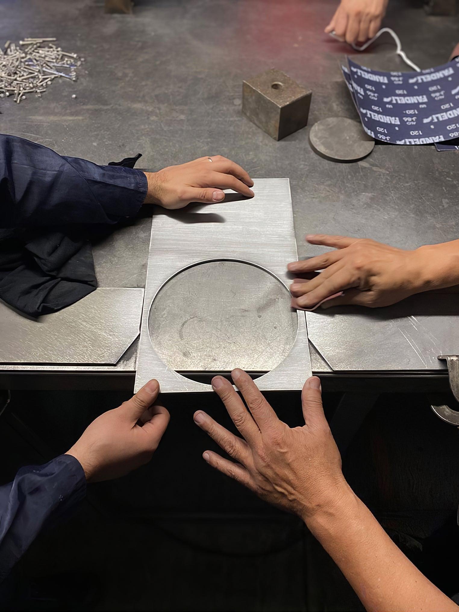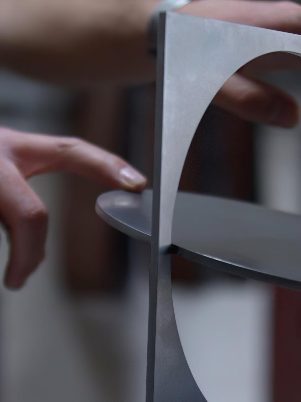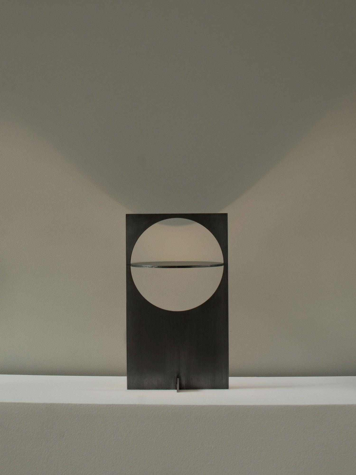 OBJ-01 是一個可以理解的簡單手勢,一個不需要解釋的對象。一目了然,它的材質、製造工藝、功能和用途一目了然。一塊未經加工的金屬板,由激光切割並用橡膠錘手工組裝,沒有焊接細木工。它的大小響應其商業標準中材料的調製和格式。純幾何圖形搭建燈具;背面有一個長方形,一個圓形,一個圓柱體,裡面有LED燈點。圓形被切開後,起到了屏幕的作用,可以360度旋轉,隨意投射光線。