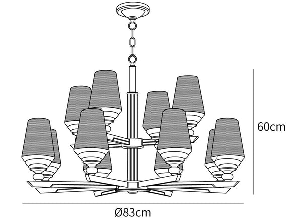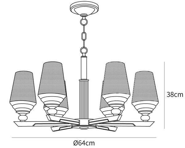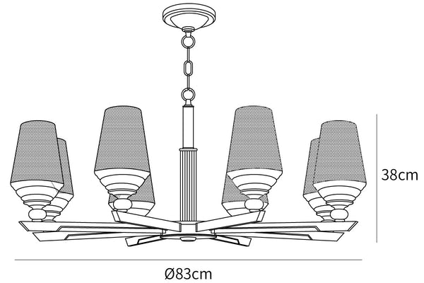 多面玻璃的同心環向內和向外折射光線。受 20 世紀奧地利枝形吊燈的啟發,它將帶棱紋的玻璃與實心黃銅框架配對。透明的玻璃葉片在外面有浮雕,在裡面閃閃發光。枝形吊燈發出令人驚嘆的光芒。