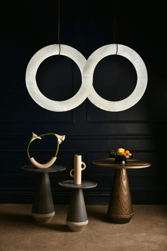 單獨或成群,奧斯陸的發光環在太空中閃耀。柔軟的皮革扣件凸顯了其輕盈的質感。由 Janedeor INC. 生產。