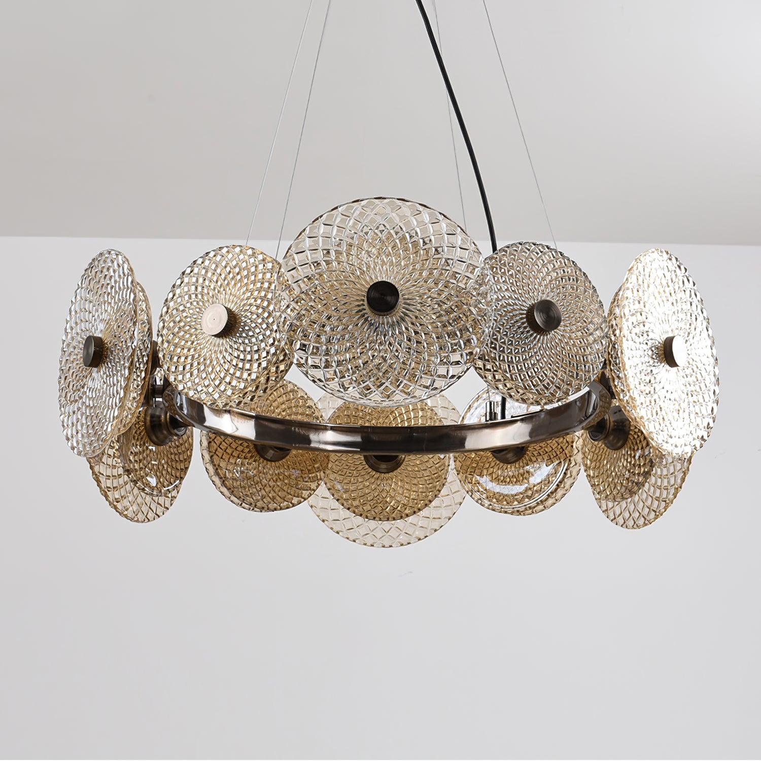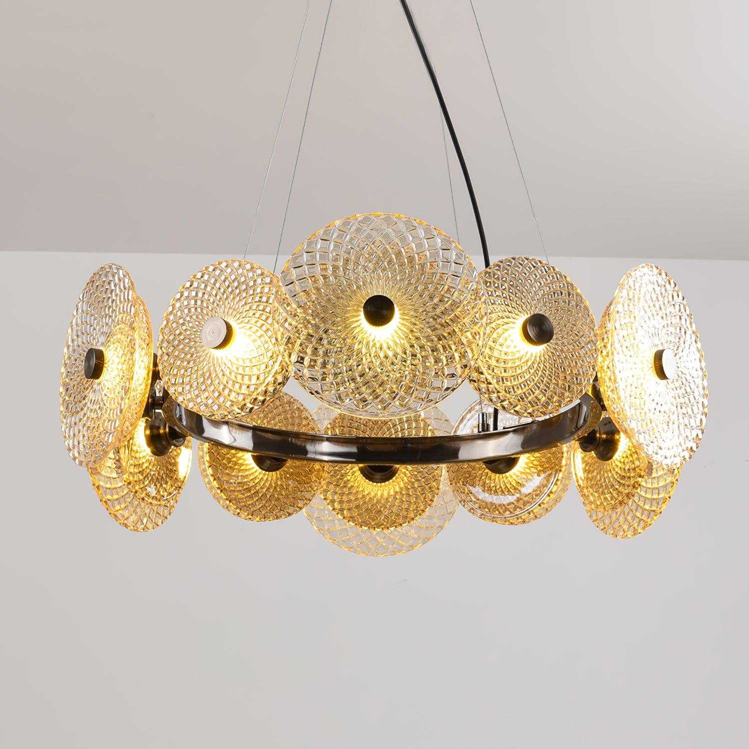 Paige 採用多層枕形設計,營造出雕塑般的效果。當光線透過玻璃結構時,口音散發出溫暖的光芒。拉絲黑鐵構成了枝形吊燈的框架和管道。青銅色調具有質感和交錯的設置,營造出乾涉和照明的和諧平衡。
