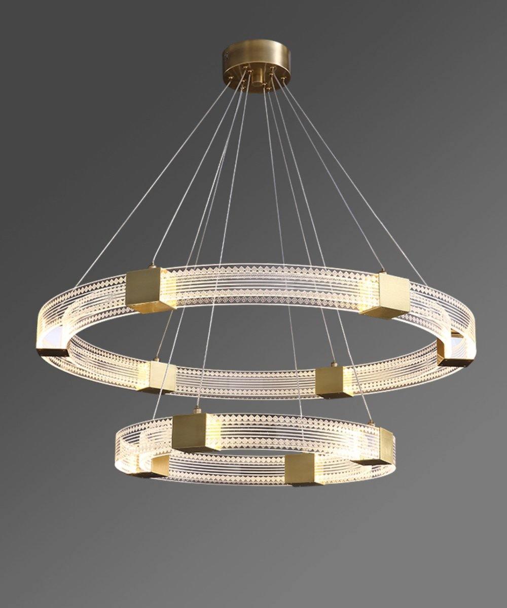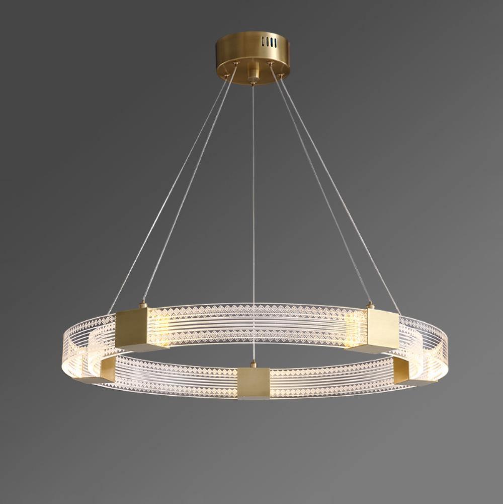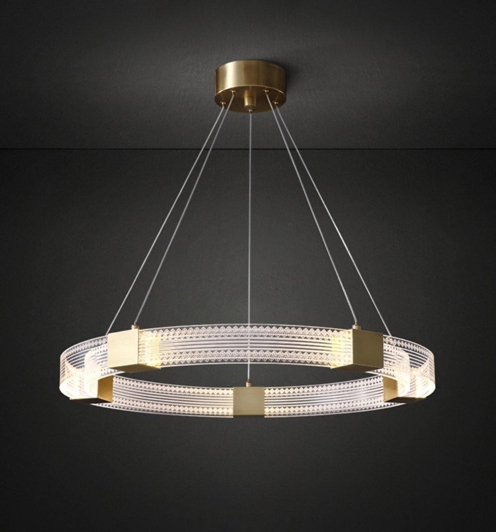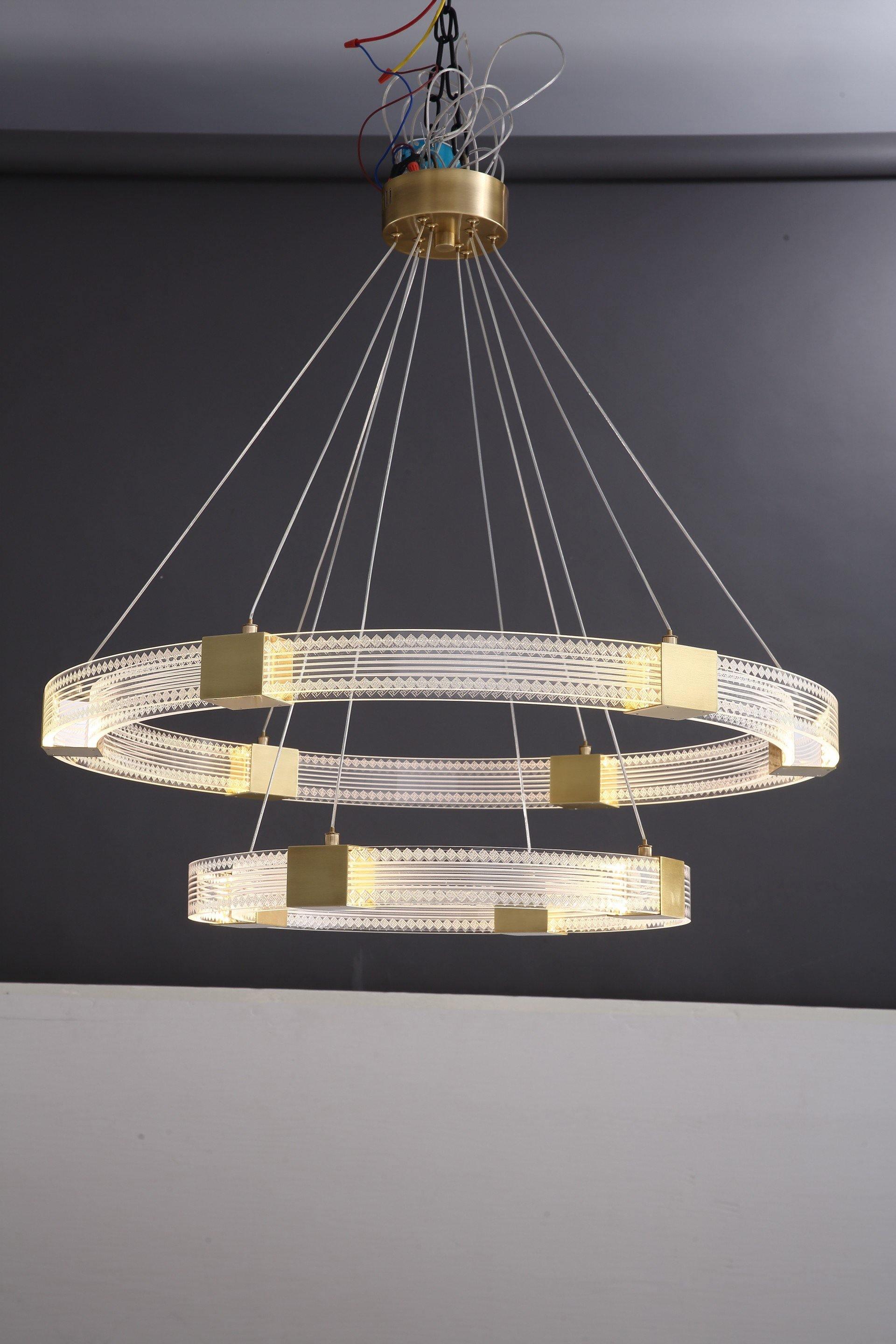 平行環 LED 枝形吊燈將手工奢華與現代設計相結合。它的環形輪廓由平行的手工製作、有紋理的亞克力面板組成,這些面板由成品黃銅嵌件連接。這些黃銅嵌件包含集成的 LED,它們齊平地位於磨砂亞克力擴散器的後面,指向下方和側面,一旦點亮就會呈現出令人眼花繚亂的顯示效果。