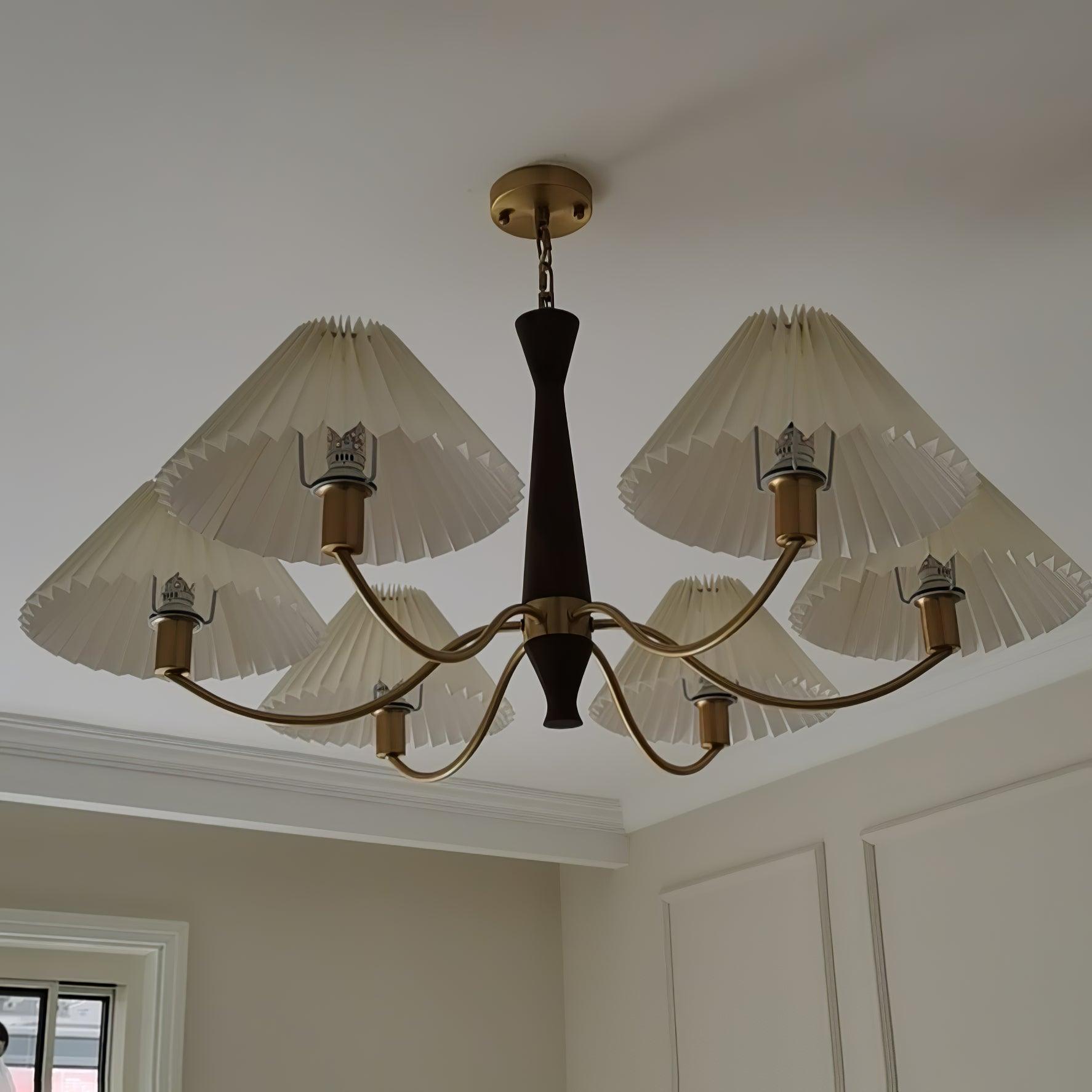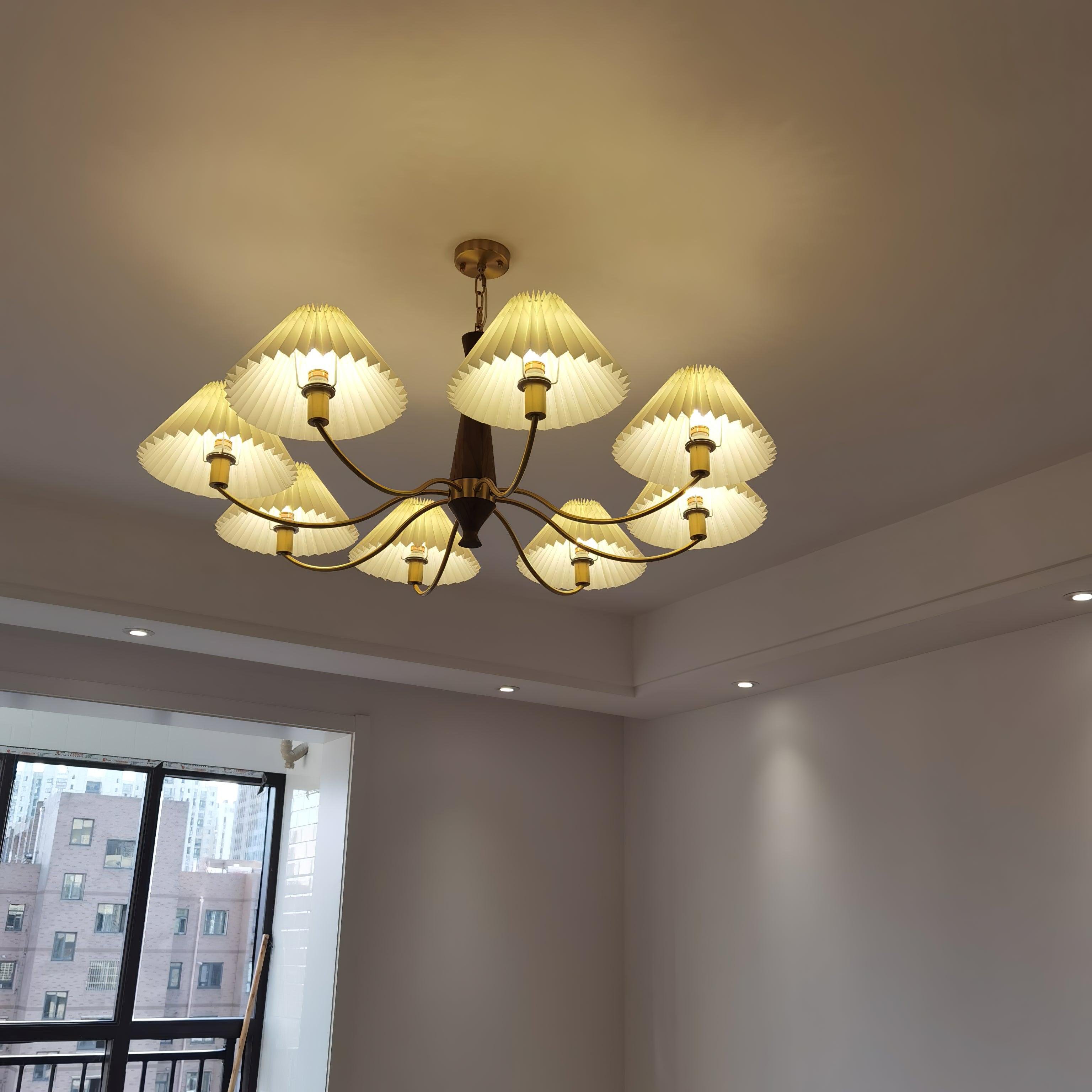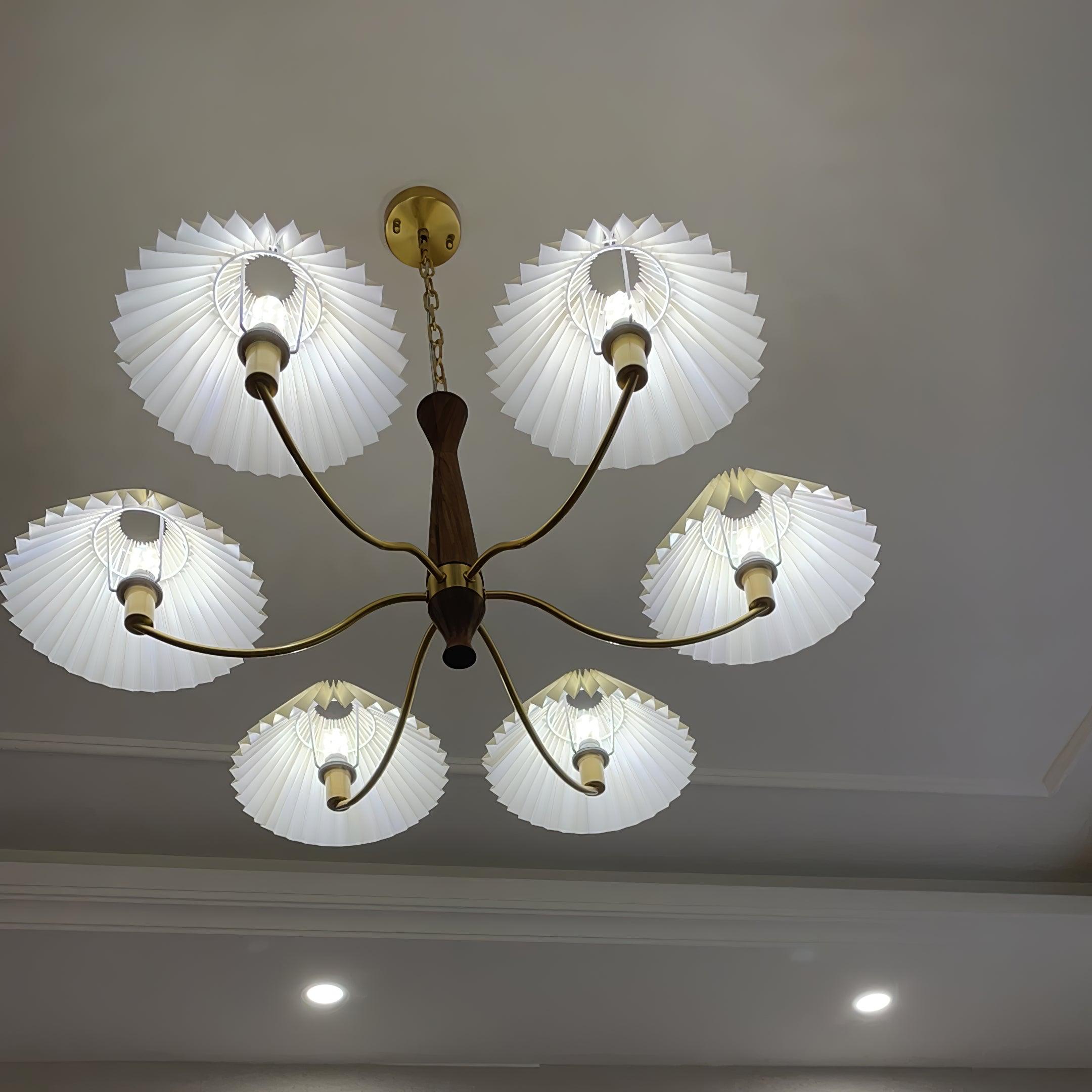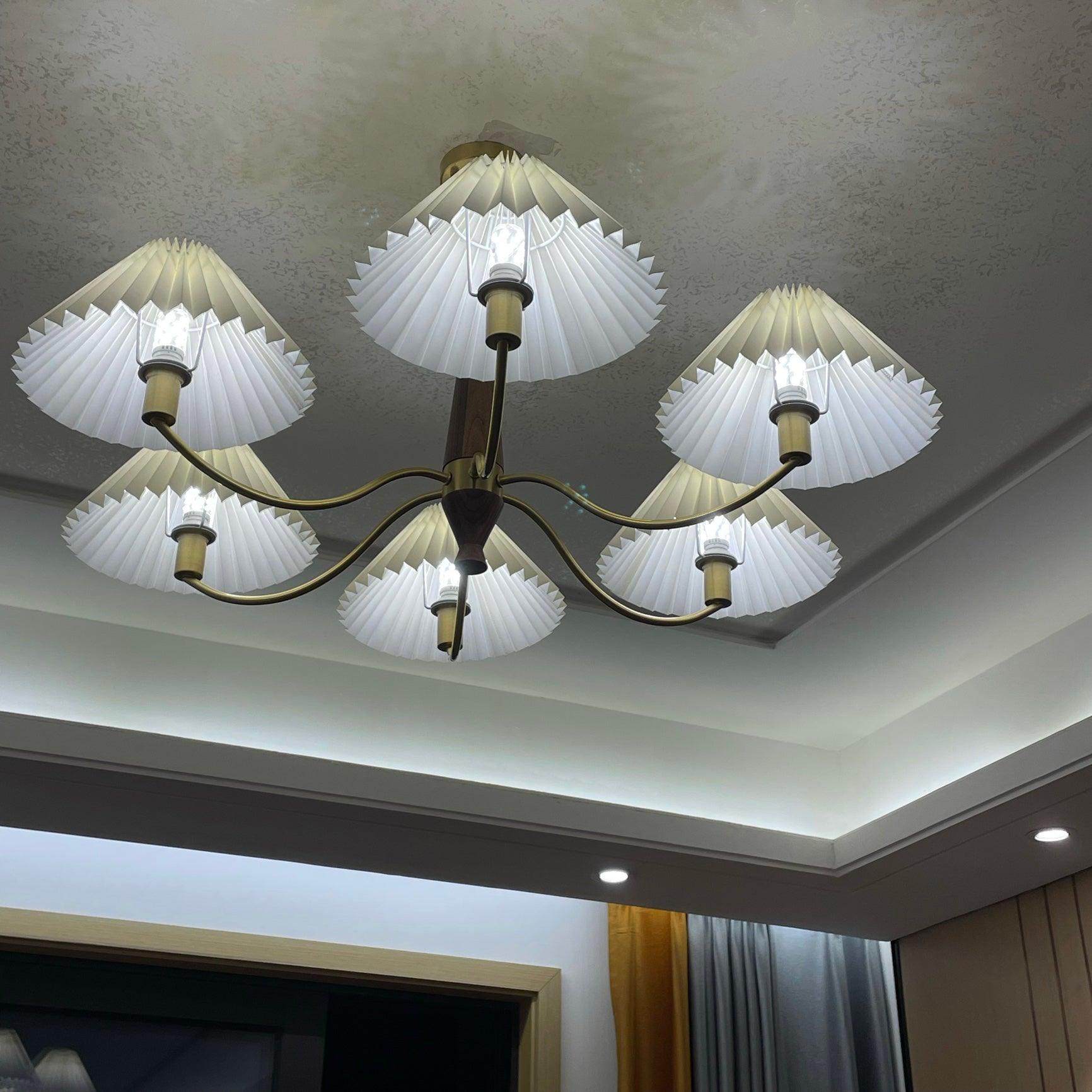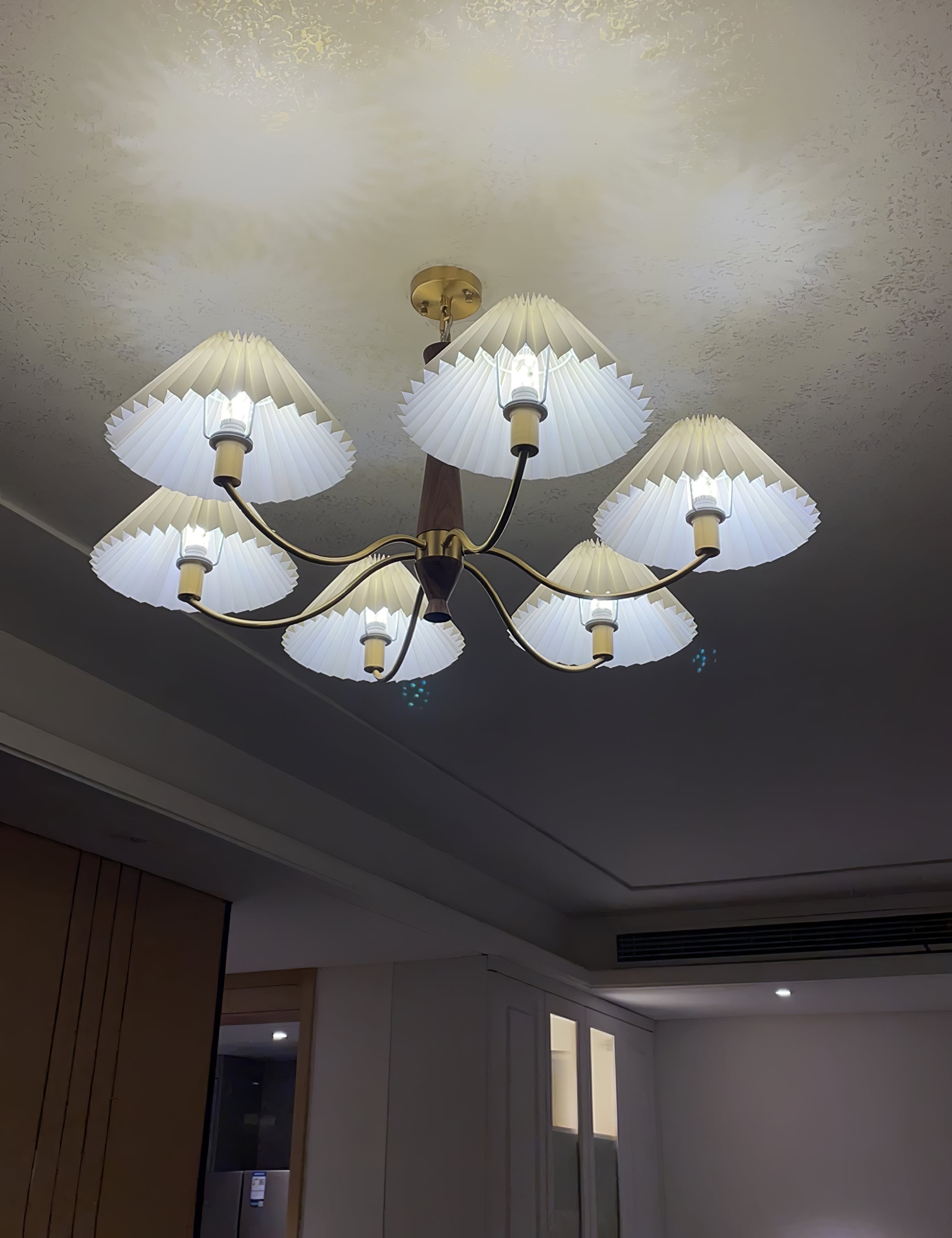 這款枝形吊燈以其弧形燈臂和簡約細節的時尚設計給人留下深刻印象。白色的褶皺燈罩巧妙地襯托出整體畫面。