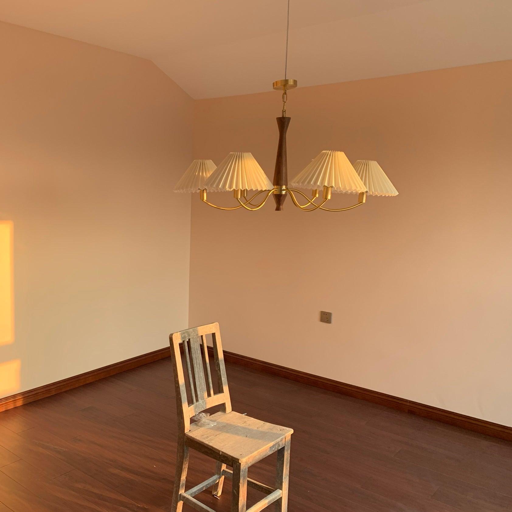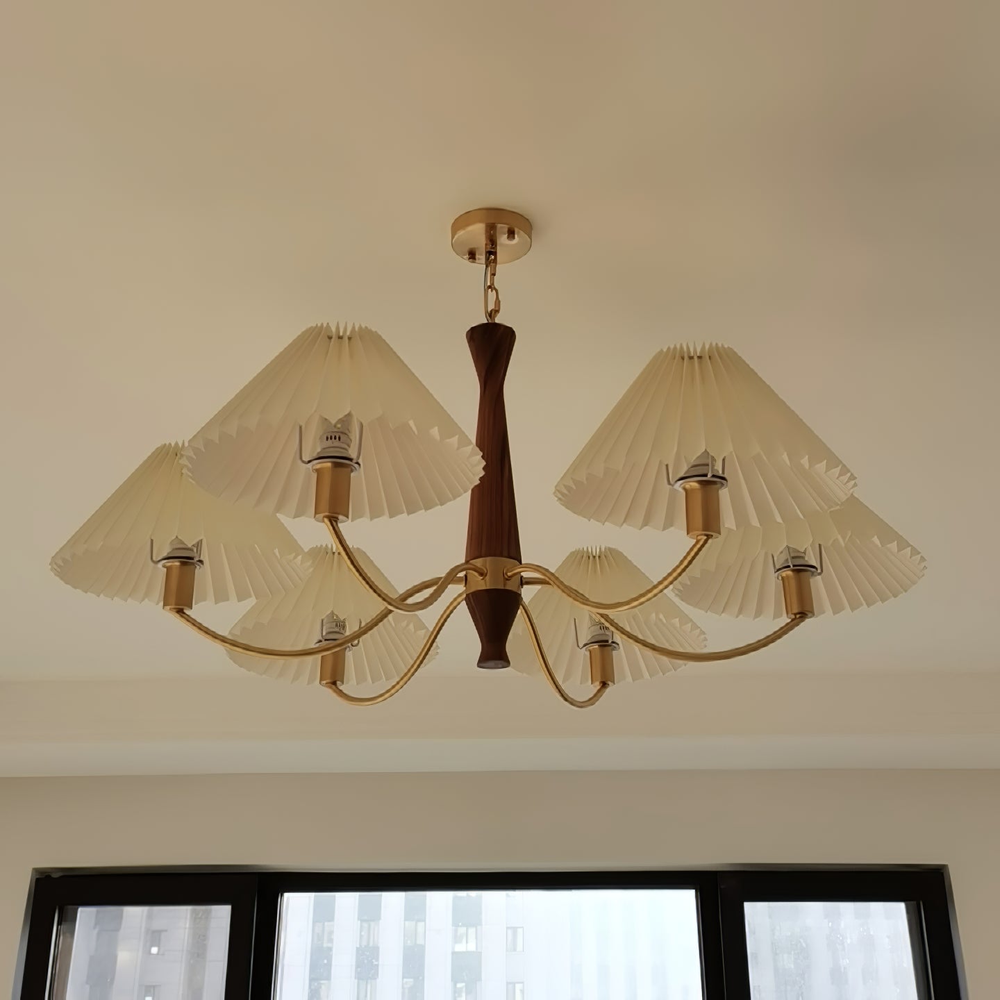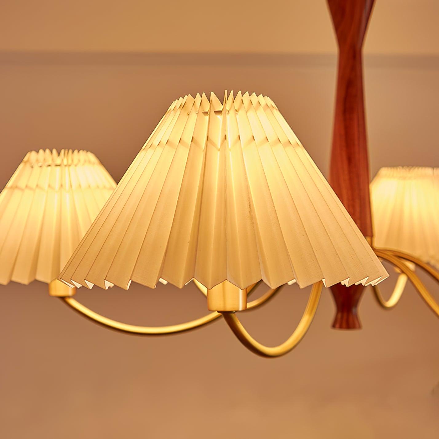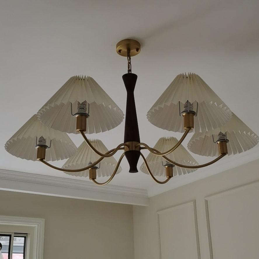 這款枝形吊燈以其弧形燈臂和簡約細節的時尚設計給人留下深刻印象。白色的褶皺燈罩巧妙地襯托出整體畫面。