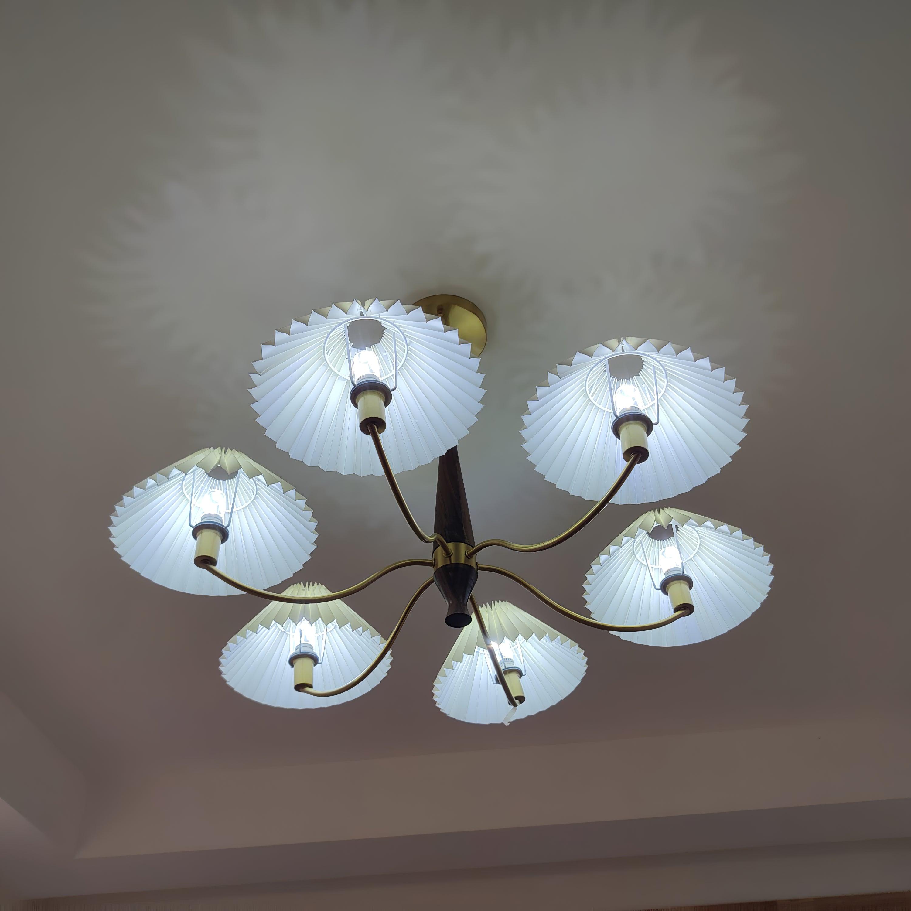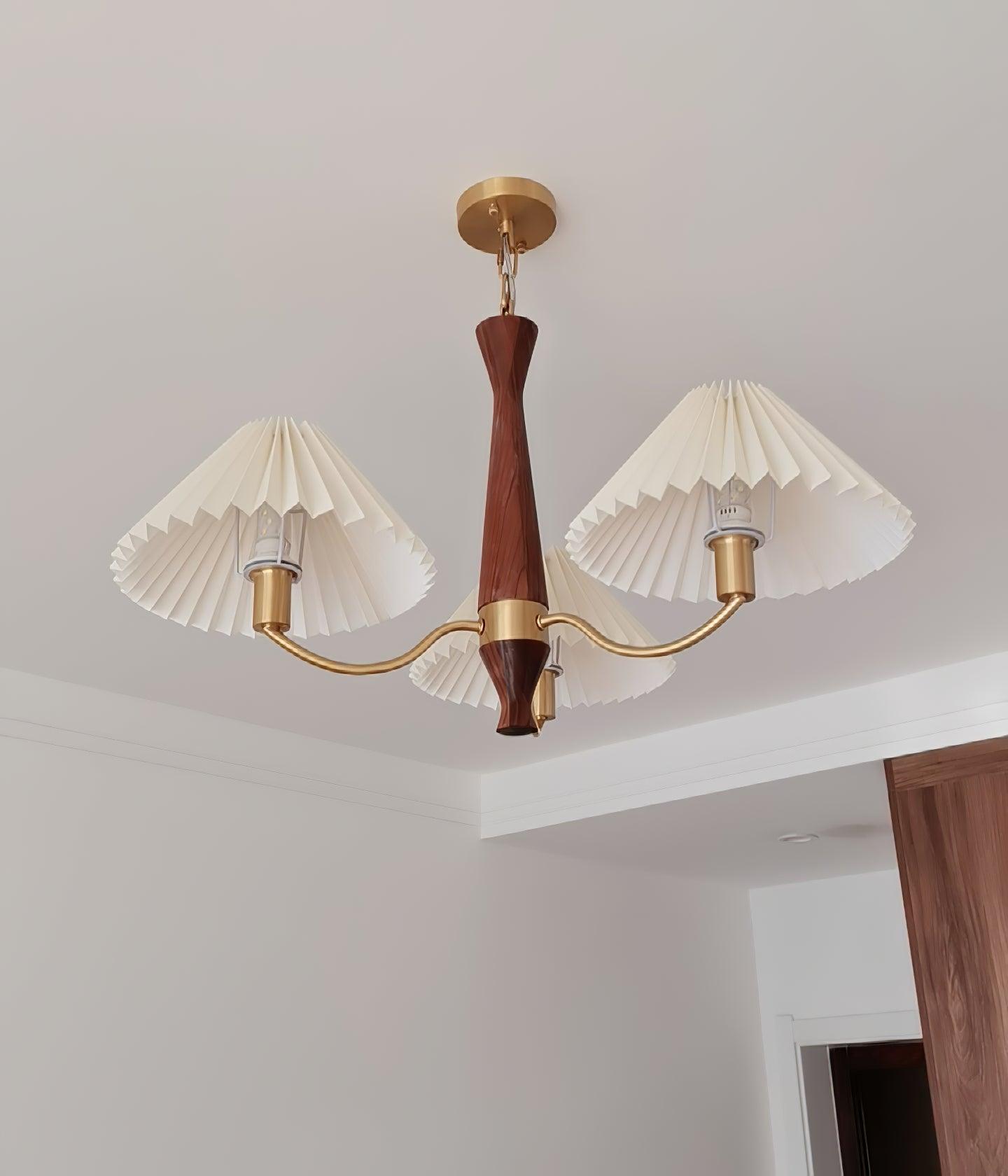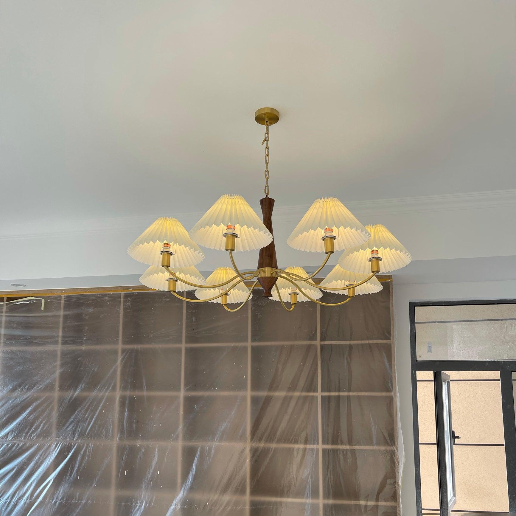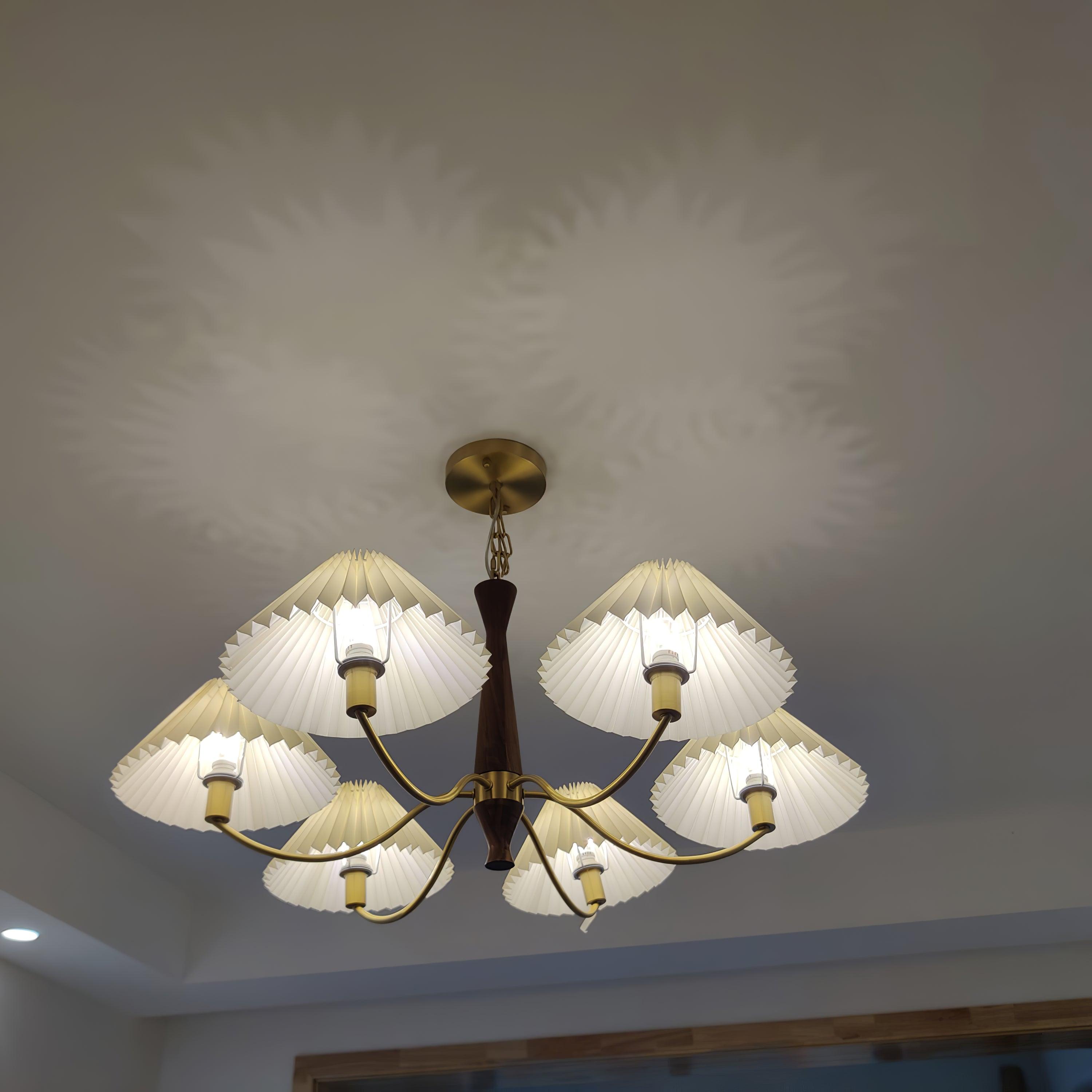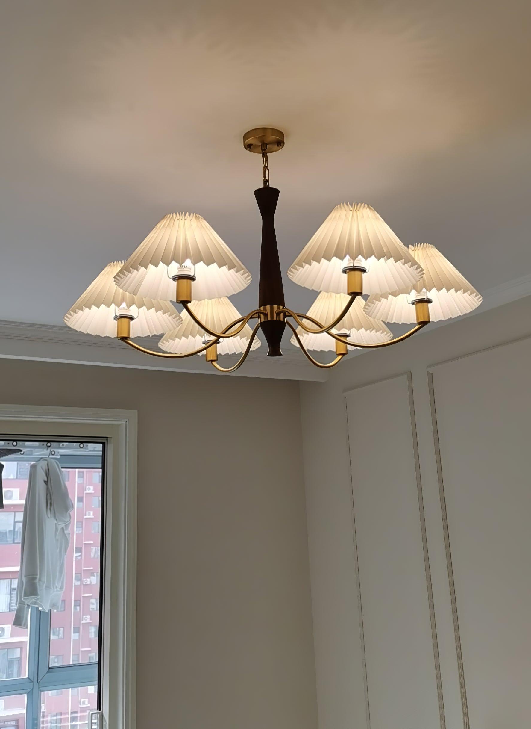 這款枝形吊燈以其弧形燈臂和簡約細節的時尚設計給人留下深刻印象。白色的褶皺燈罩巧妙地襯托出整體畫面。