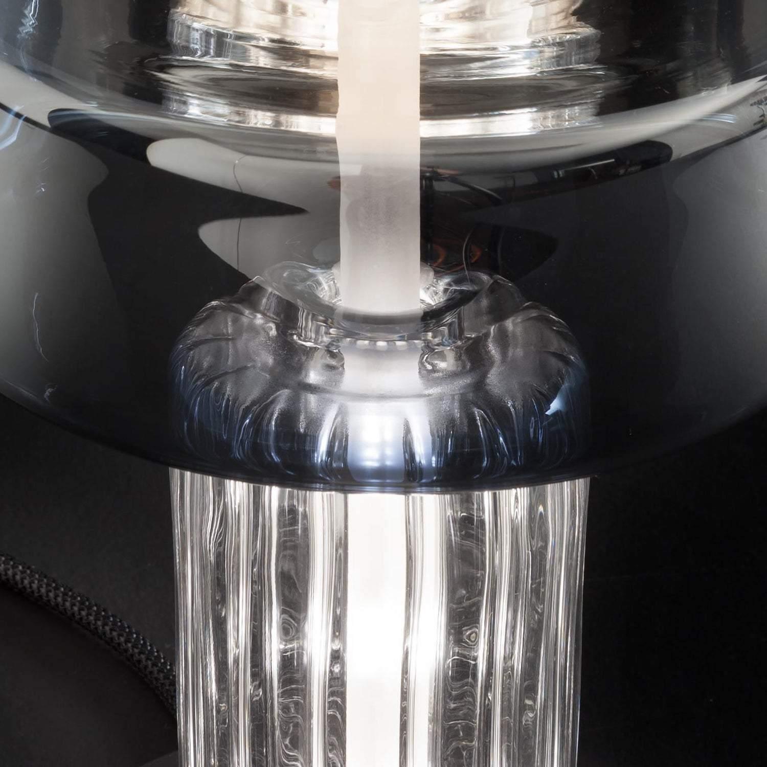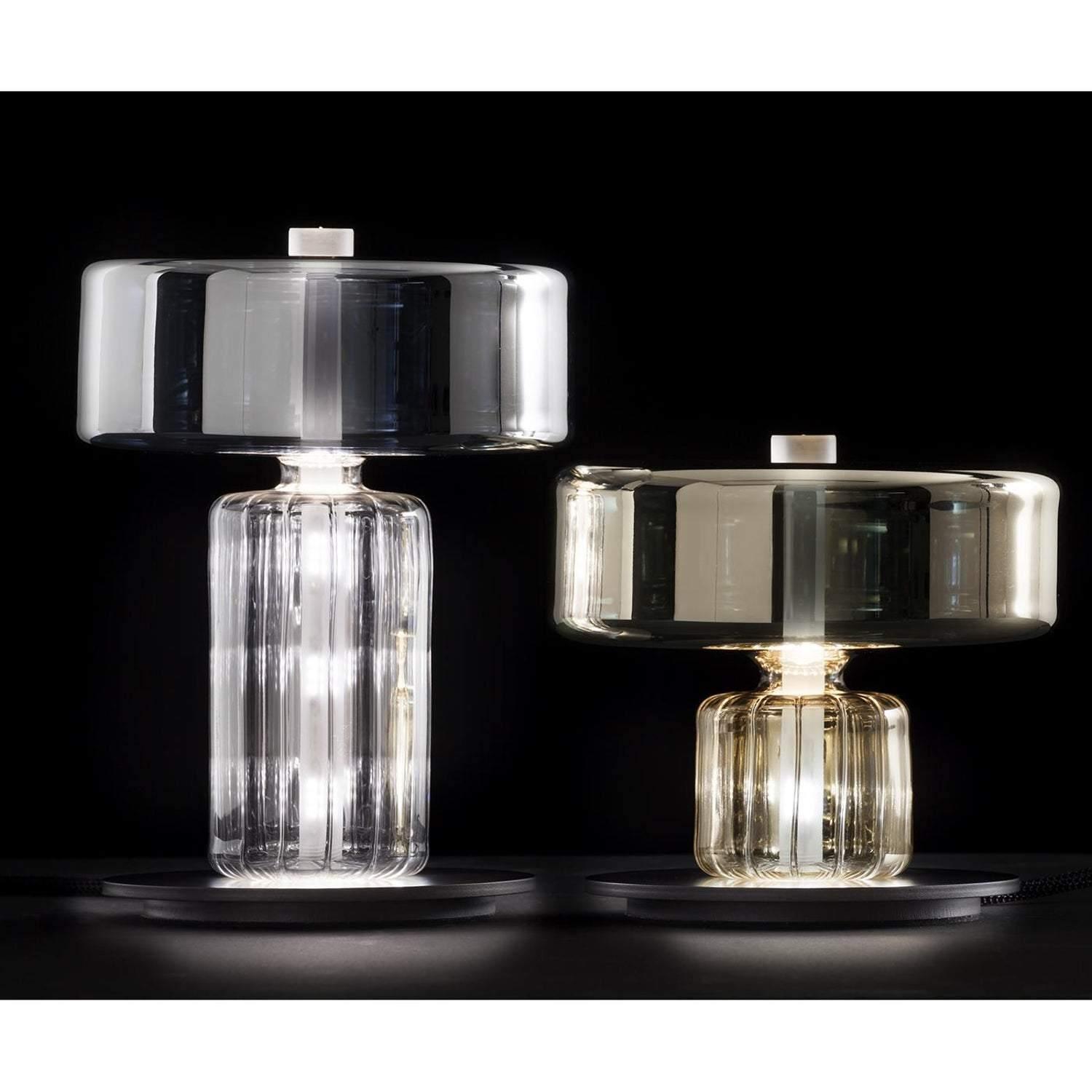 漂亮的手工吹製玻璃檯燈,有兩種尺寸。玻璃採用金色(僅限小號)或銀色(僅限大號)進行珍貴的表面處理,使其呈半透明狀。這種表面處理也是導電的,因此打開燈、調整照明級別或關閉燈就像觸摸玻璃一樣簡單。