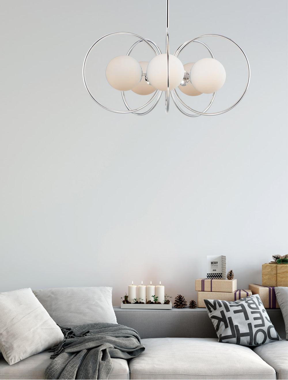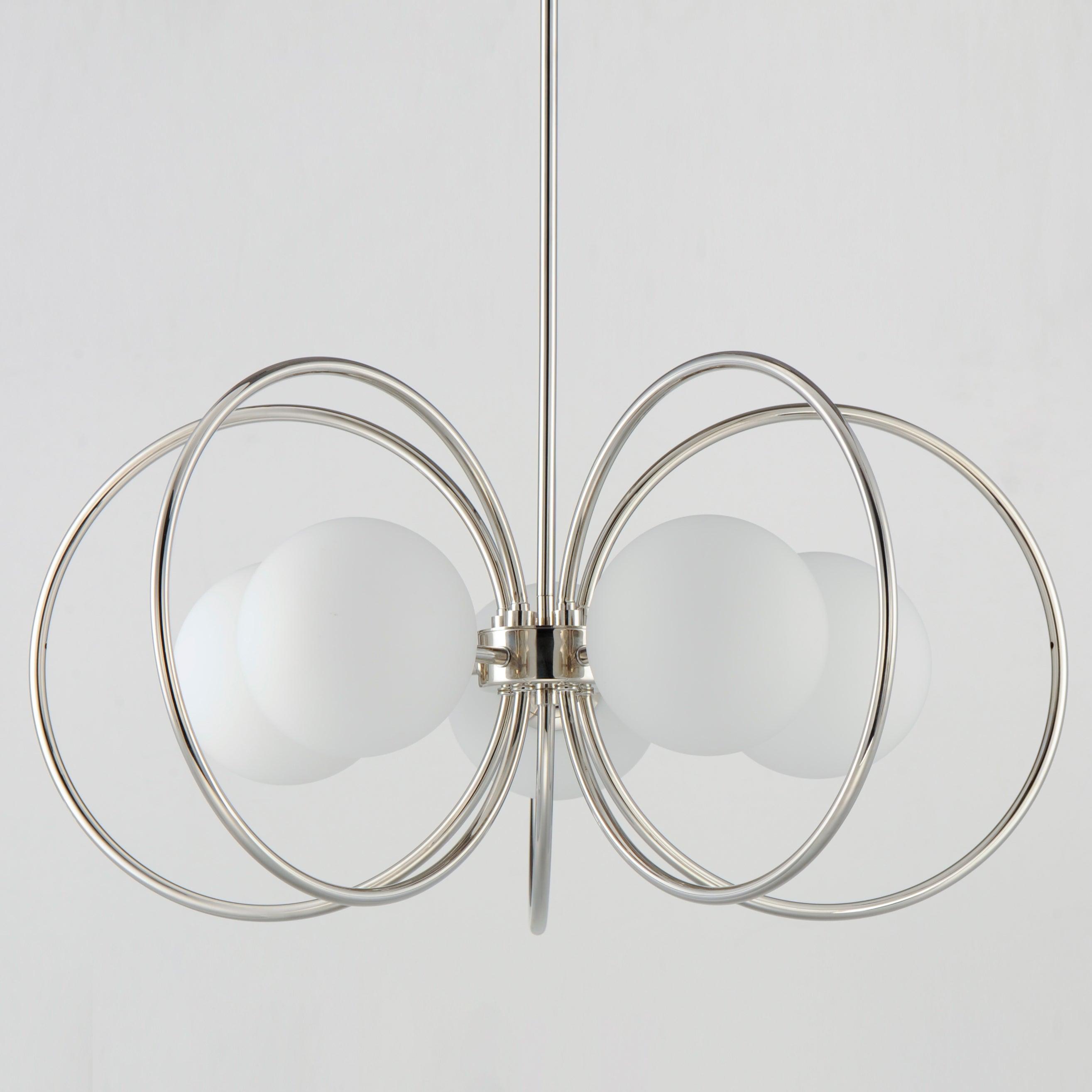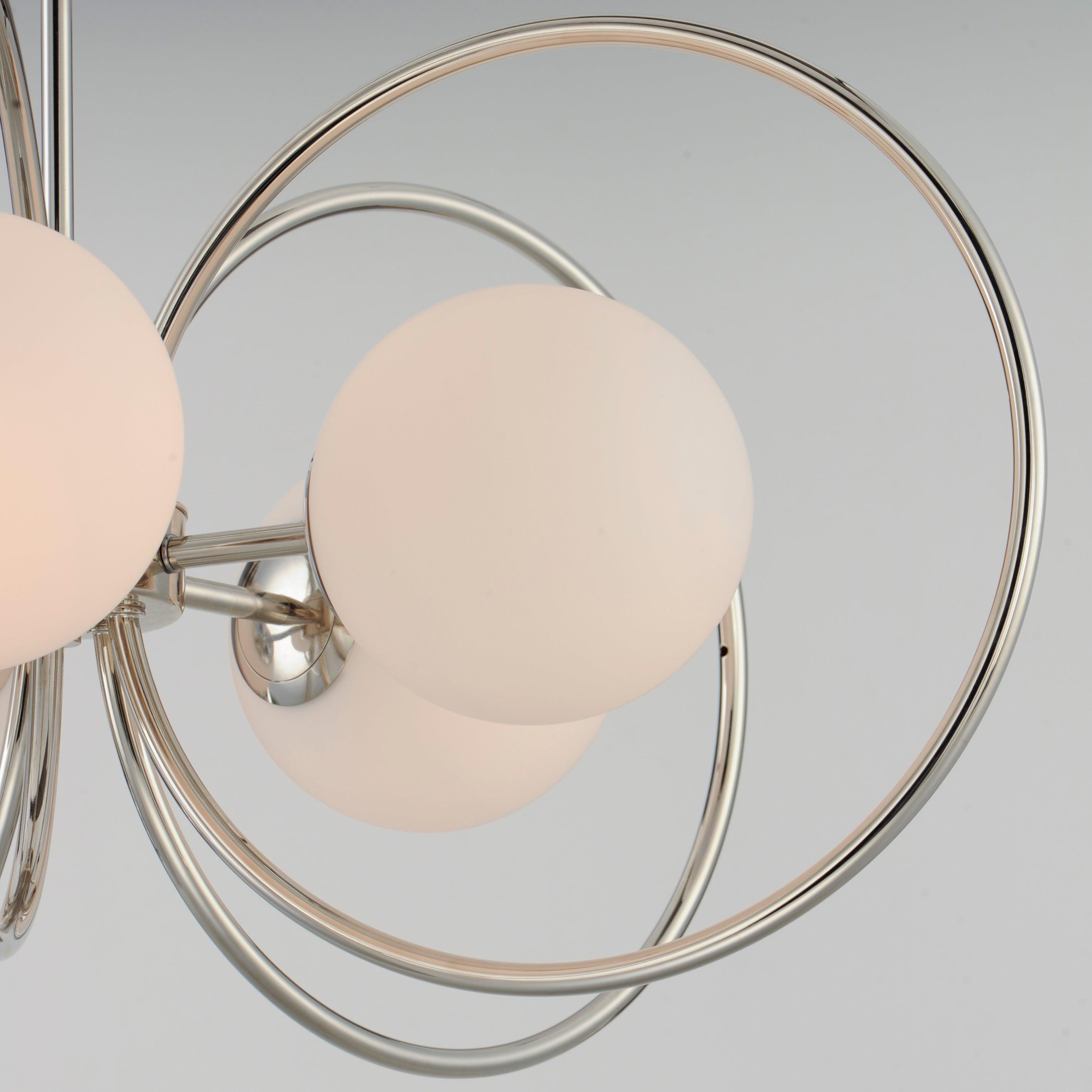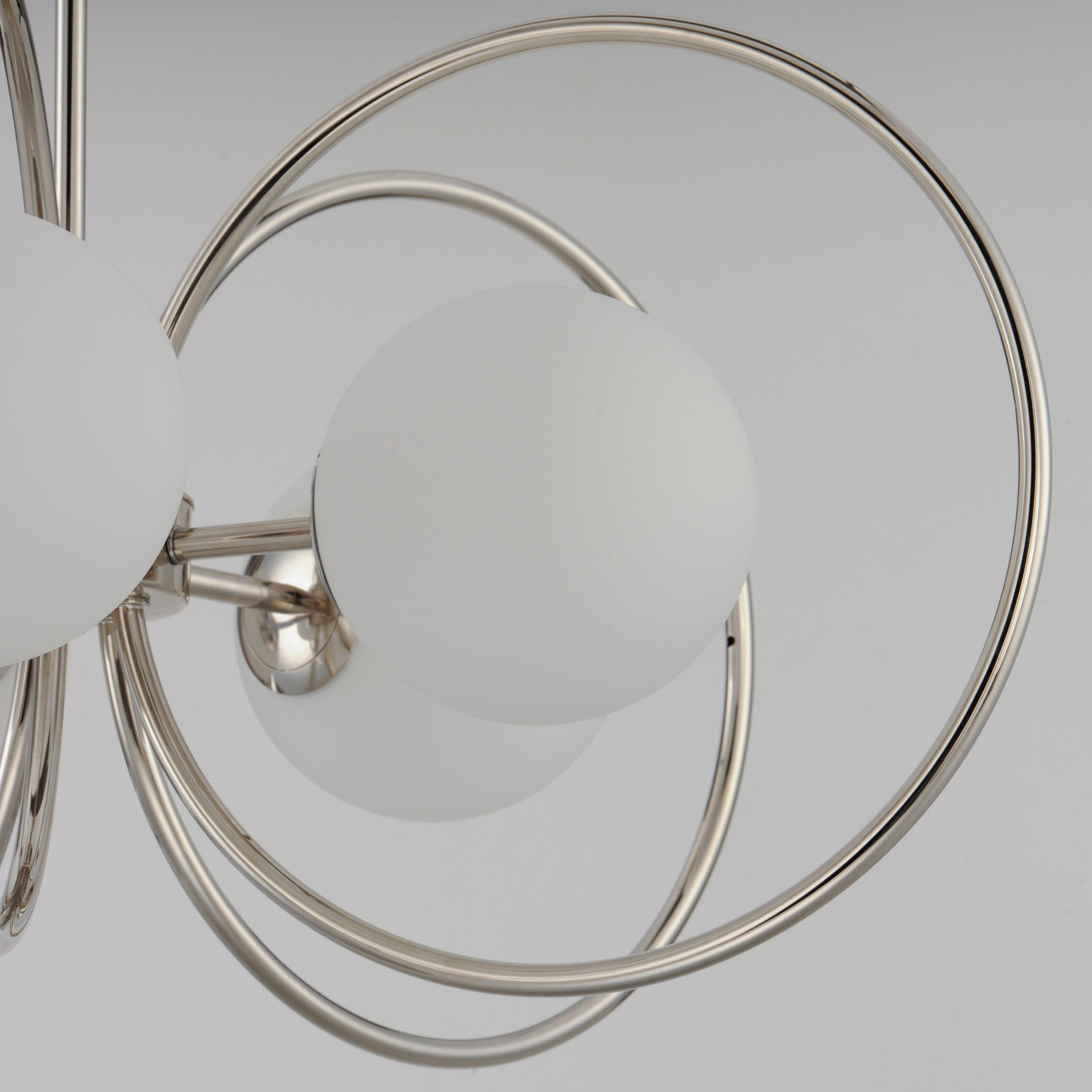 拋光鎳環環繞著緞光白玻璃球,營造出這種清爽乾淨的現代設計。當前的設計趨勢與現代和過渡美學相得益彰。