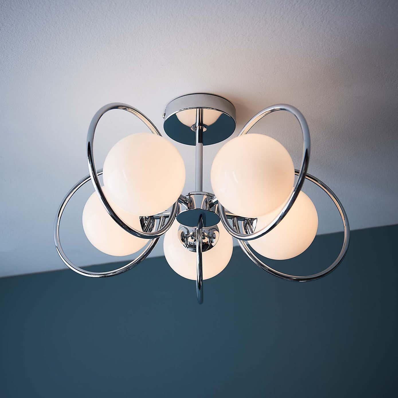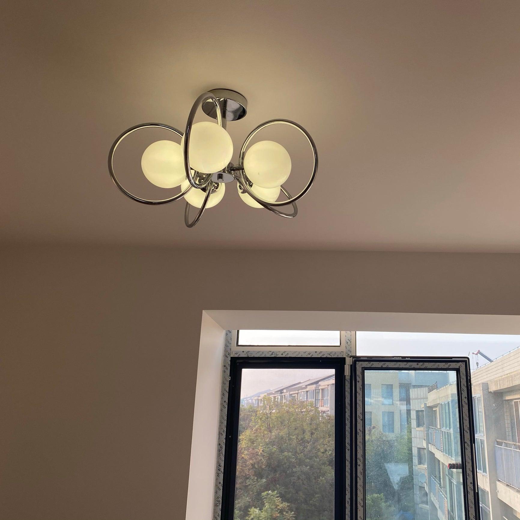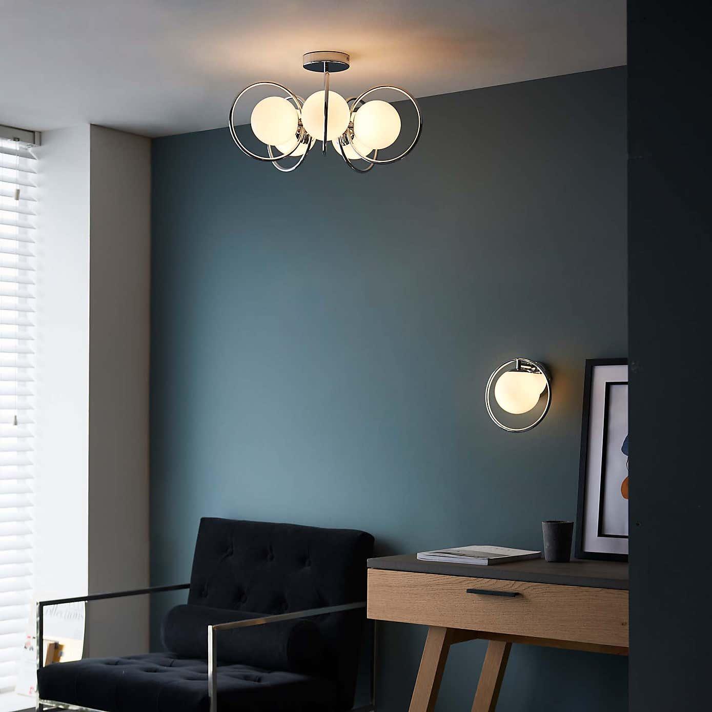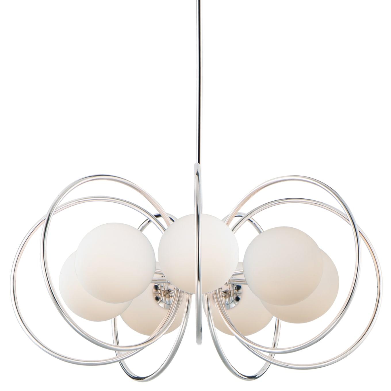 拋光鎳環環繞著緞光白玻璃球,營造出這種清爽乾淨的現代設計。當前的設計趨勢與現代和過渡美學相得益彰。