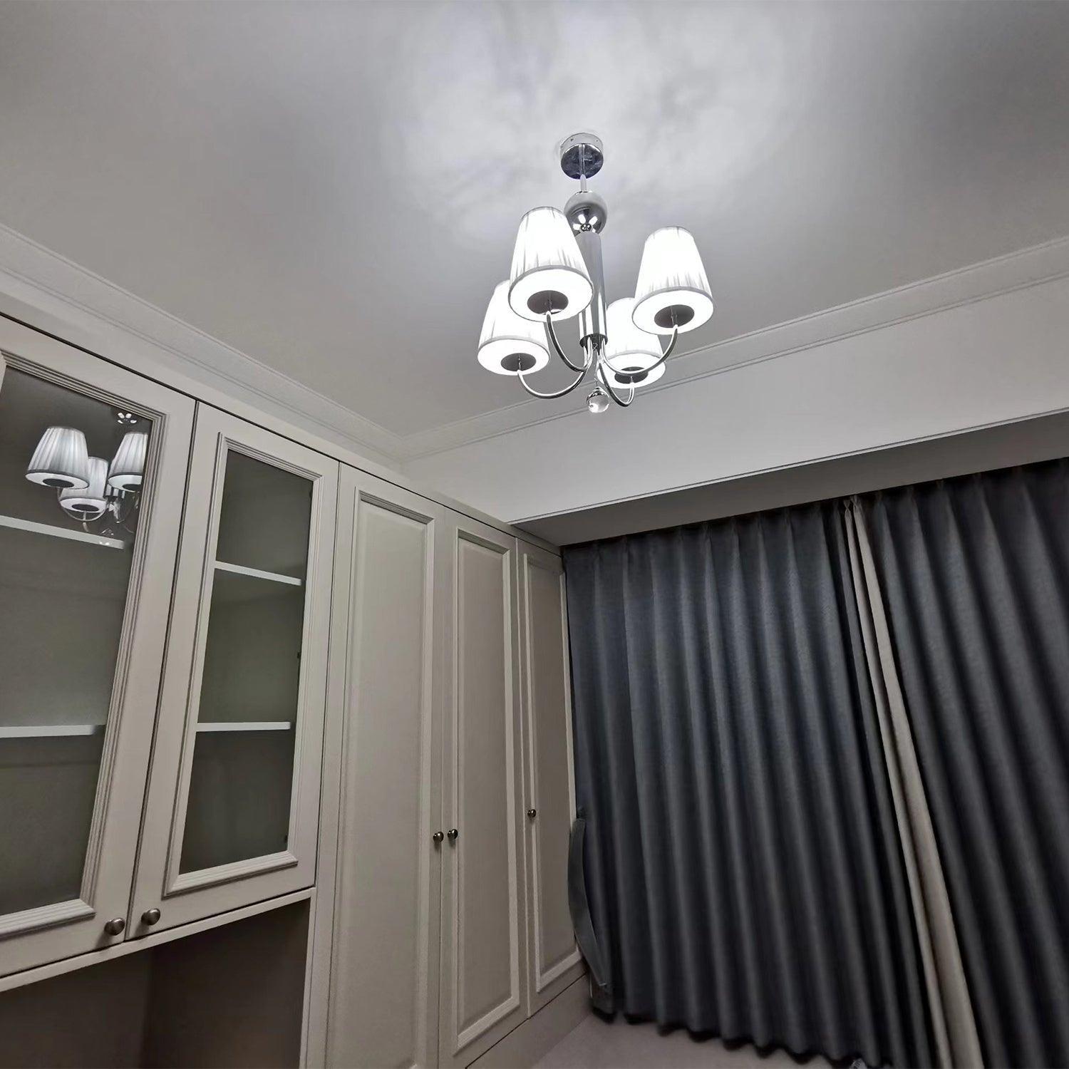 這款天花板配件是一款製作精美的燭台式枝形吊燈。精緻的鍍鉻弧形圓環從裝飾性的中央柱子中溢出,其中包含一個漂亮的多面玻璃球。這款令人愉悅的吸頂燈採用鍍鉻飾面,配有白色褶皺棉質燈罩。