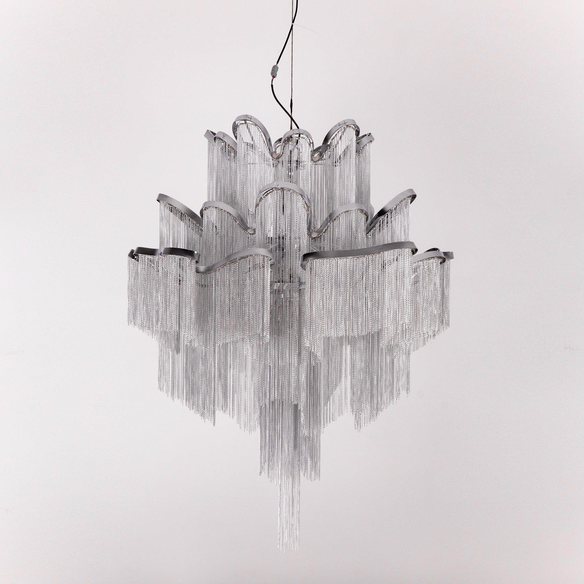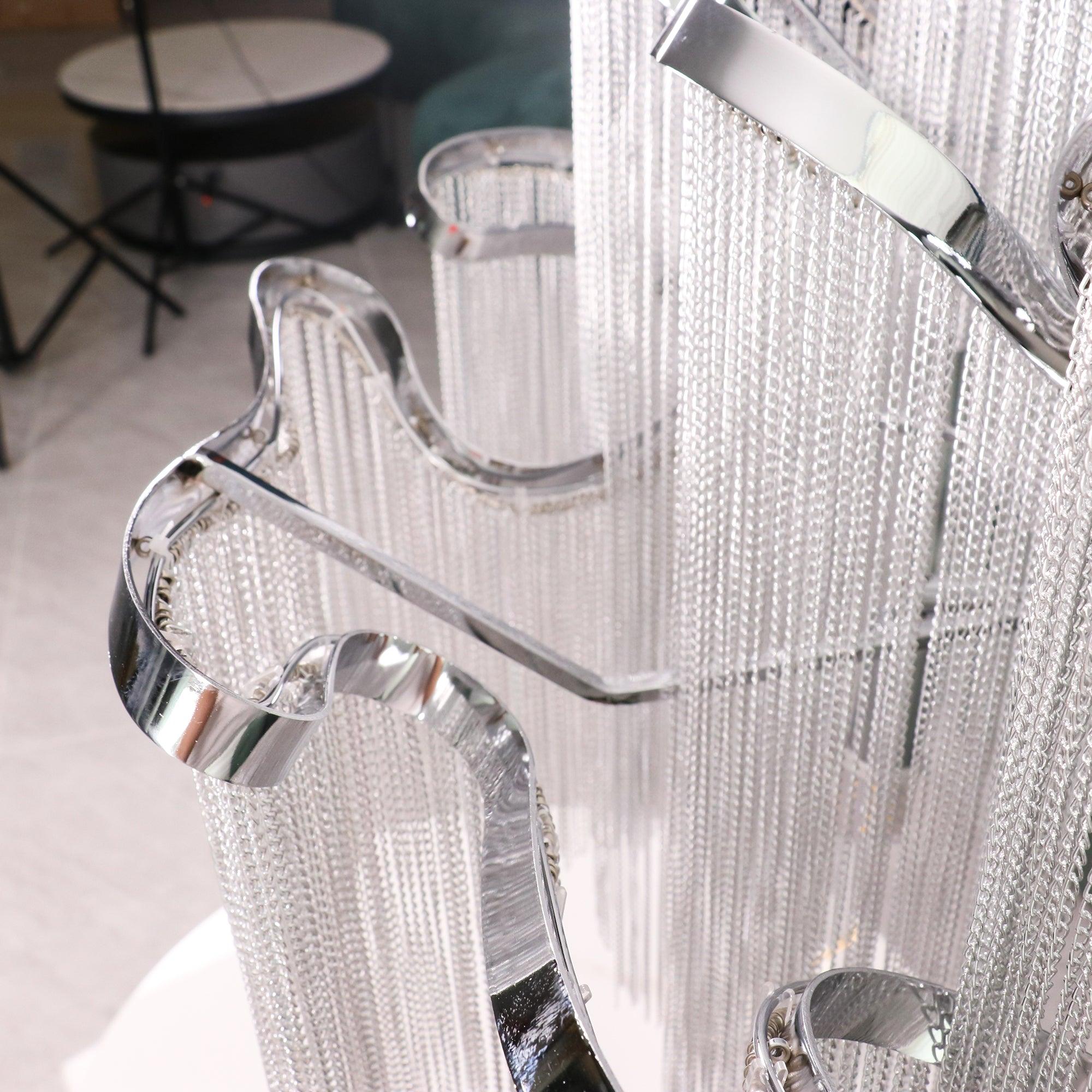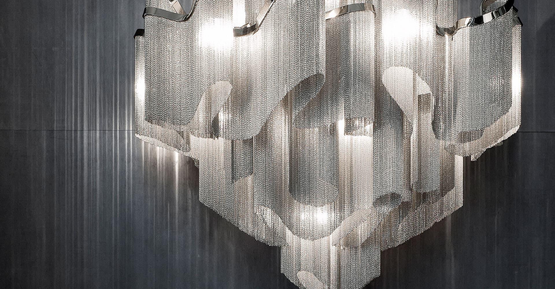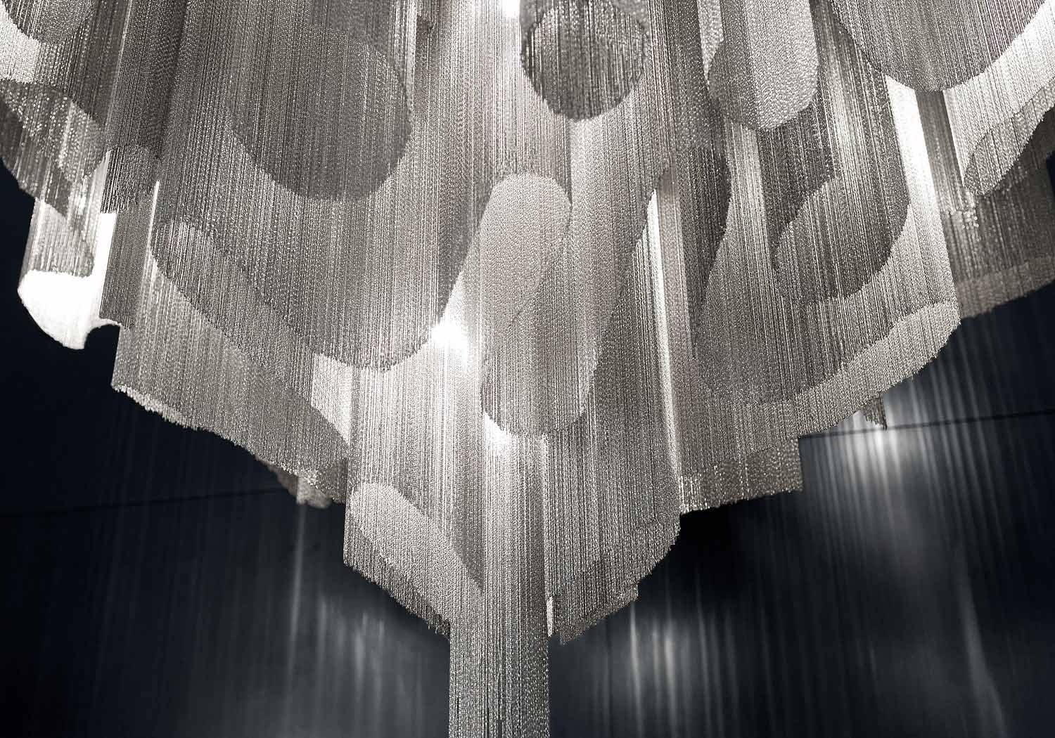 流在任何房間都令人印象深刻。 Stream 的設計利用材料的物理特性將房間包裹在獨特的沉浸式燈光中。在這裡,超過七厘米的金屬鏈條似乎順著起伏的鍍鎳框架流淌而下。這些層疊的層次在整個房間投下了條紋和寧靜的陰影。