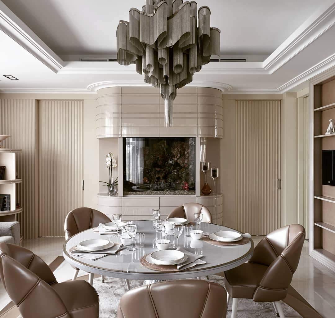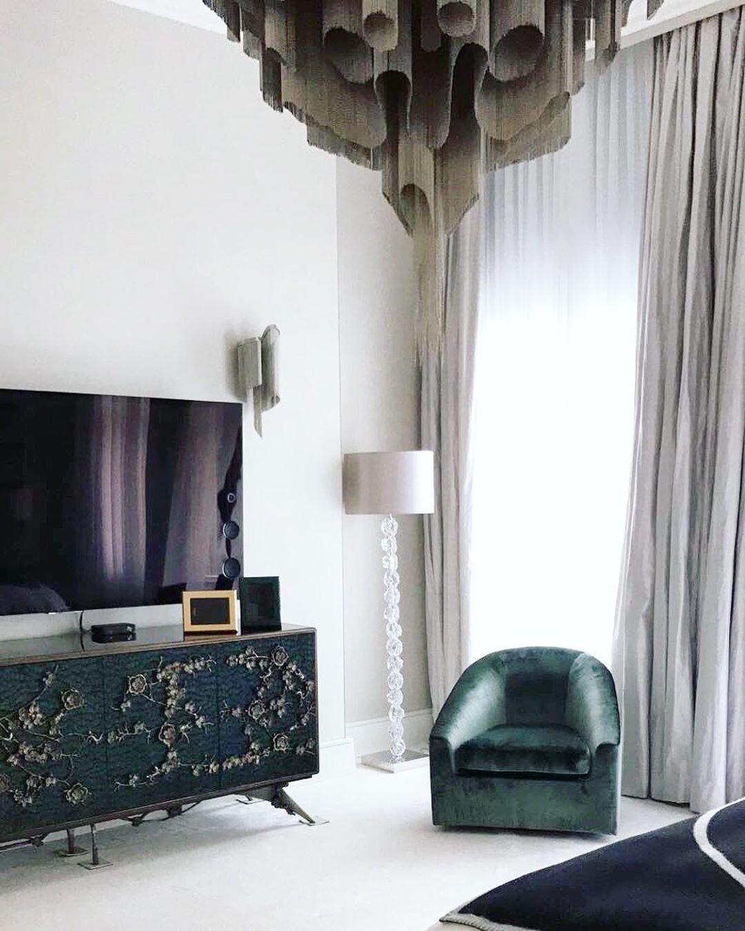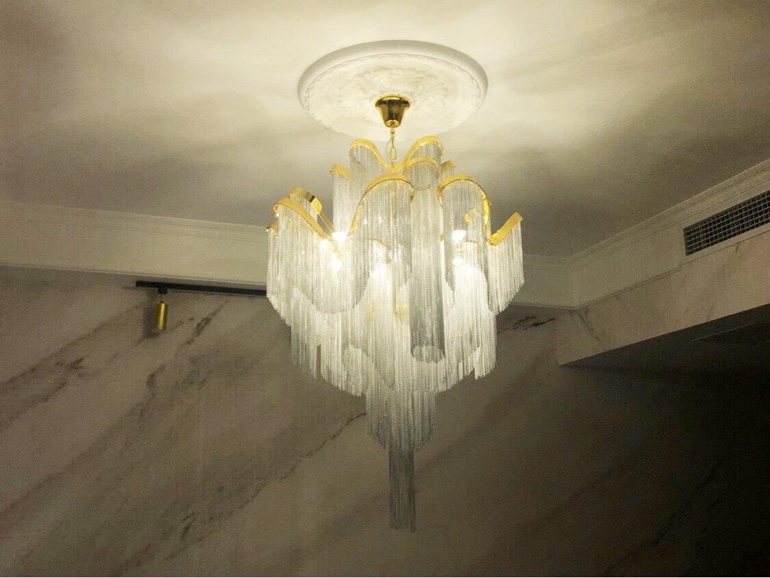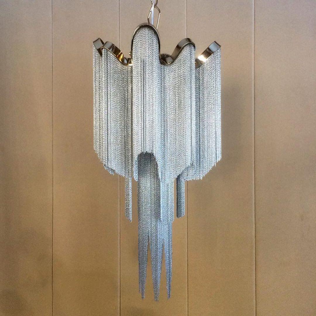 流在任何房間都令人印象深刻。 Stream 的設計利用材料的物理特性將房間包裹在獨特的沉浸式燈光中。在這裡,超過七厘米的金屬鏈條似乎順著起伏的鍍鎳框架流淌而下。這些層疊的層次在整個房間投下了條紋和寧靜的陰影。