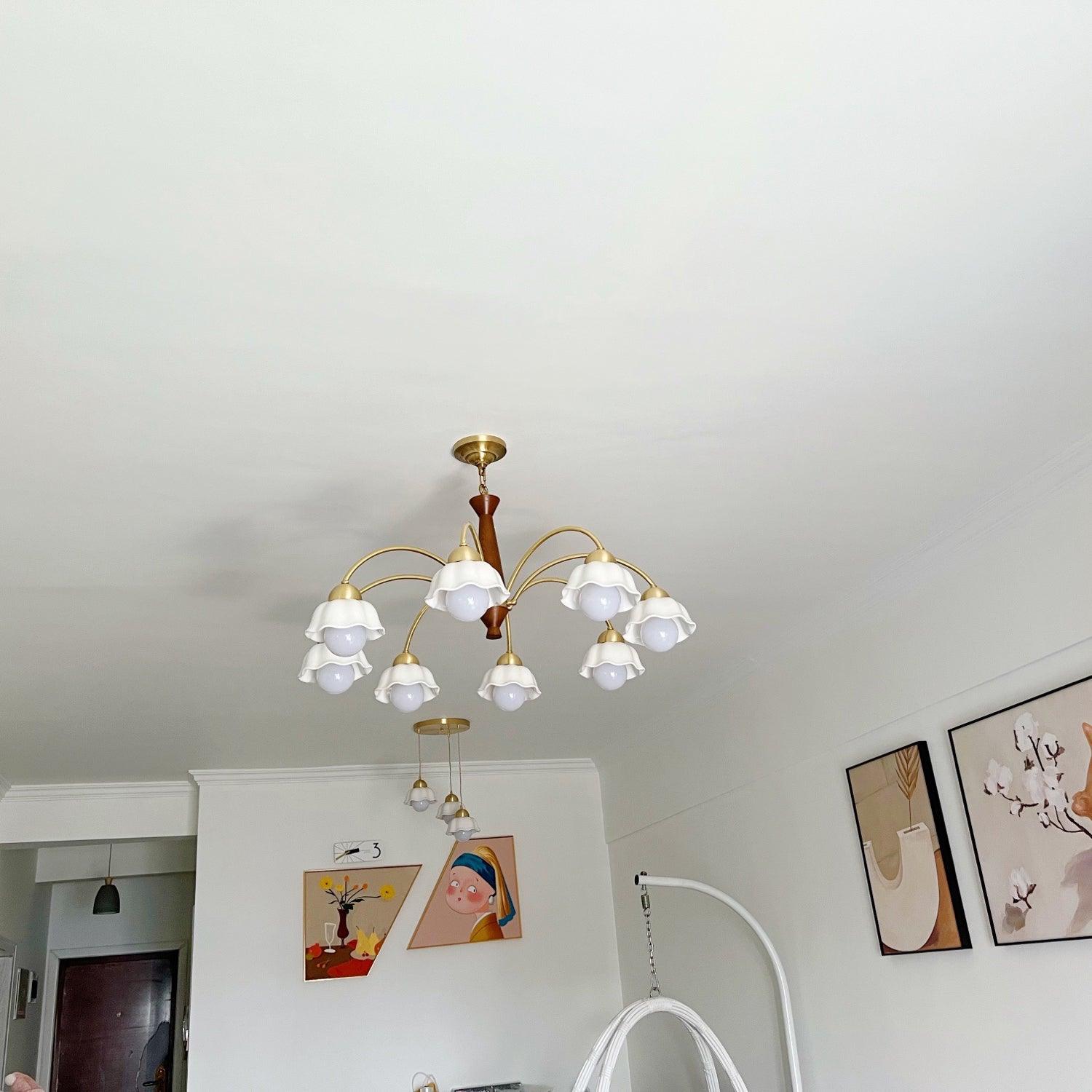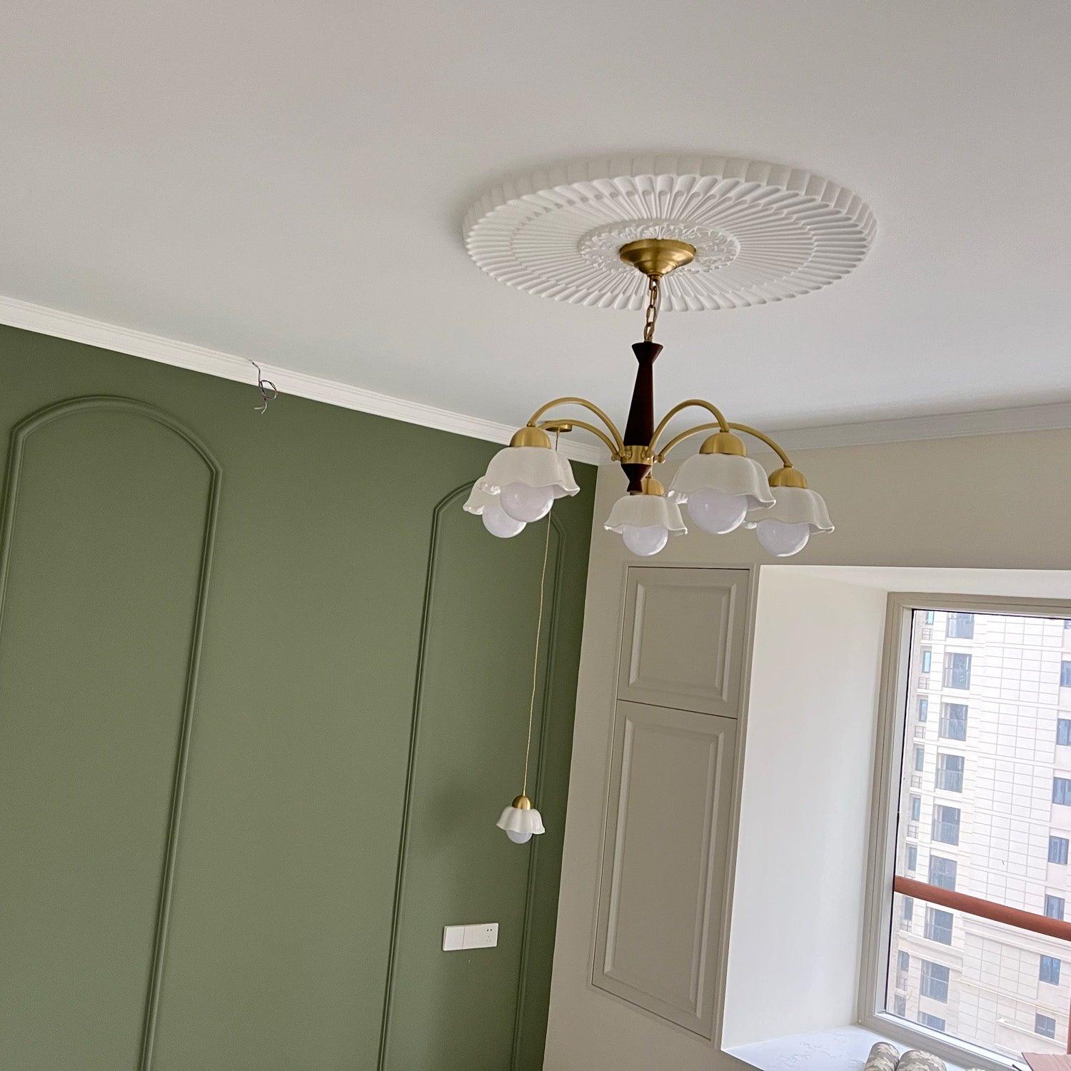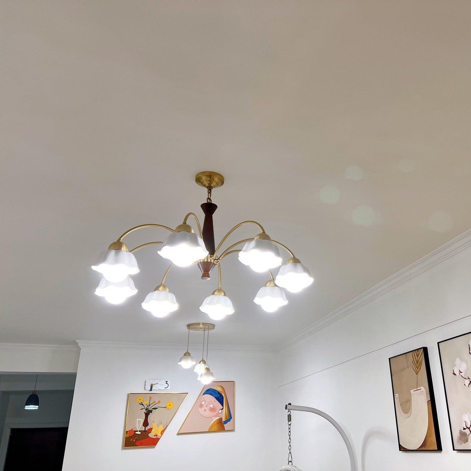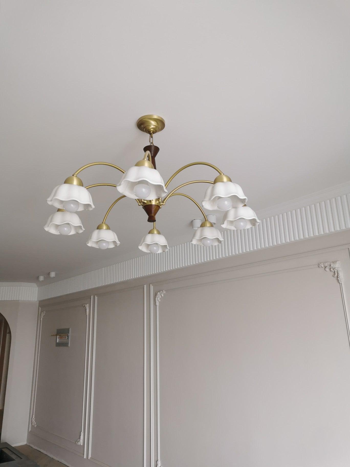 罕見的中世紀枝形吊燈,採用黃銅、木材和磨砂蛋白石陶瓷製成。這盞吊燈做工很有品質感,細節也很到位。它具有五個光源,隱藏在乳白色陶瓷燈罩下。黃銅臂連接到木製中心裝飾品。