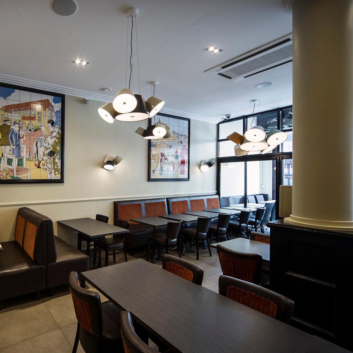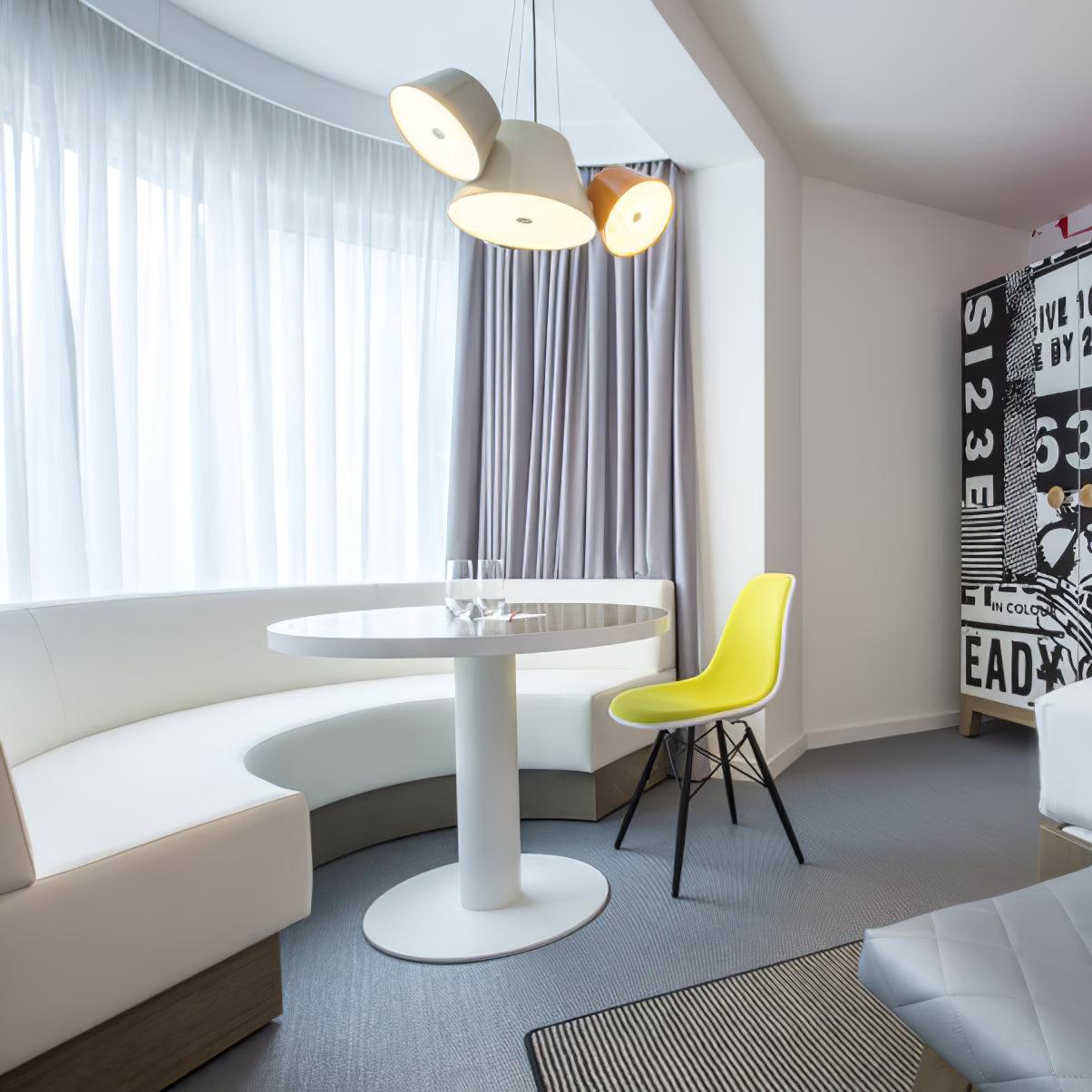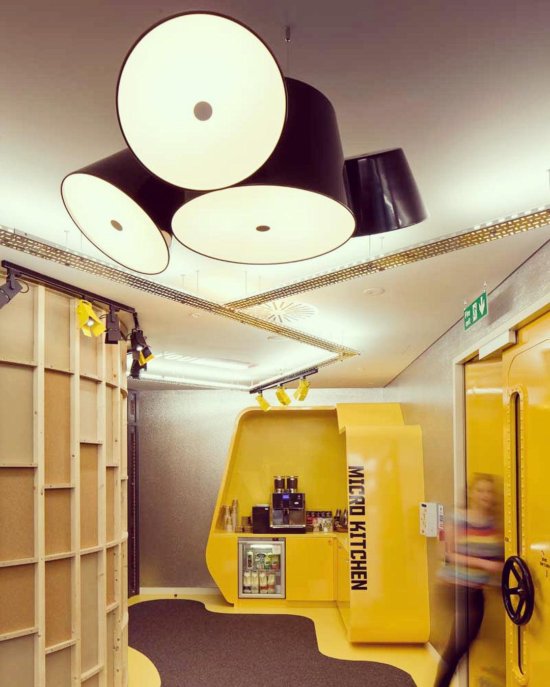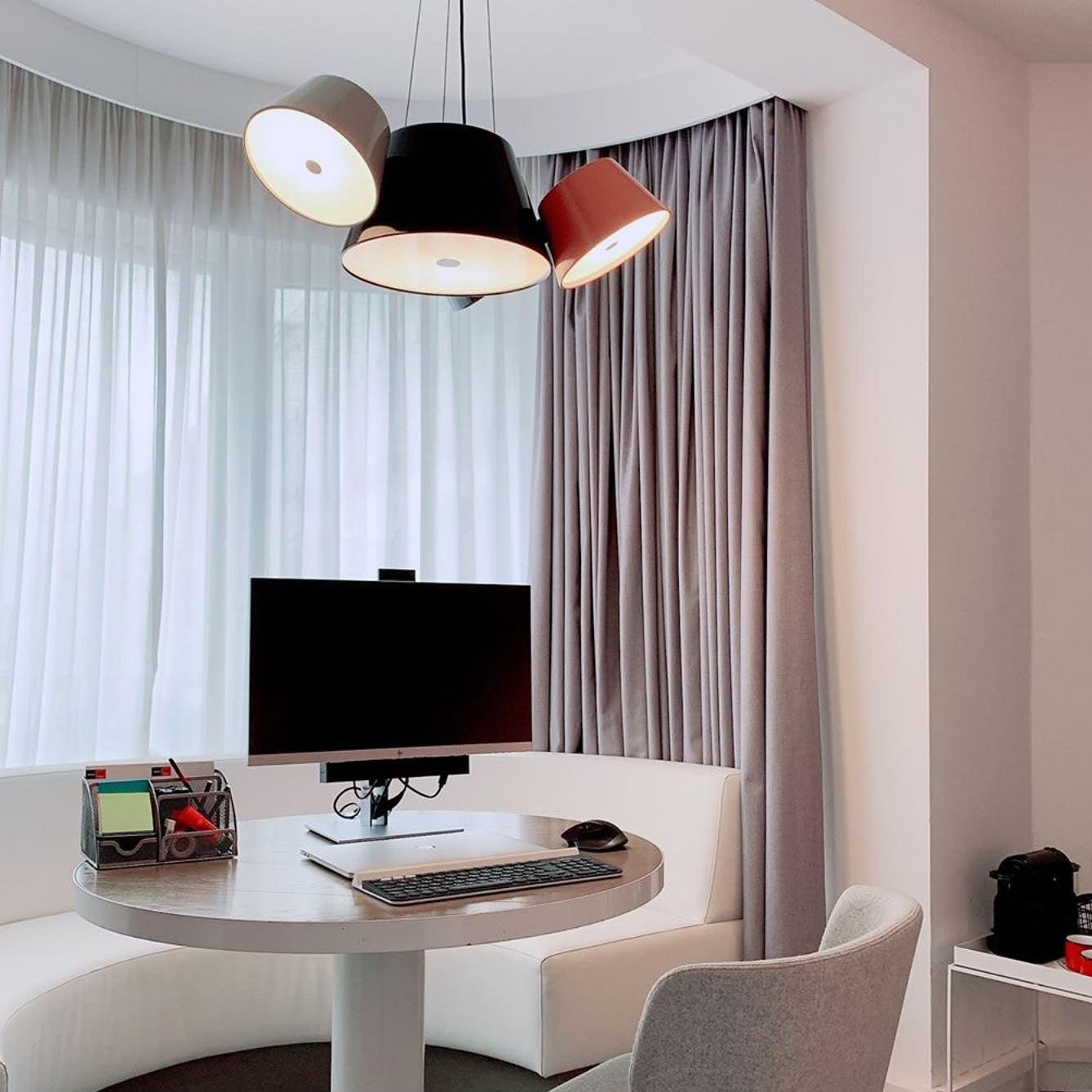 Tam Tam 由一個漆鋁中央組成,上面附有各種衛星燈罩,可以通過旋轉機構旋轉 360º。開口端上方的乳白色甲基丙烯酸酯漫射器柔化了光線。