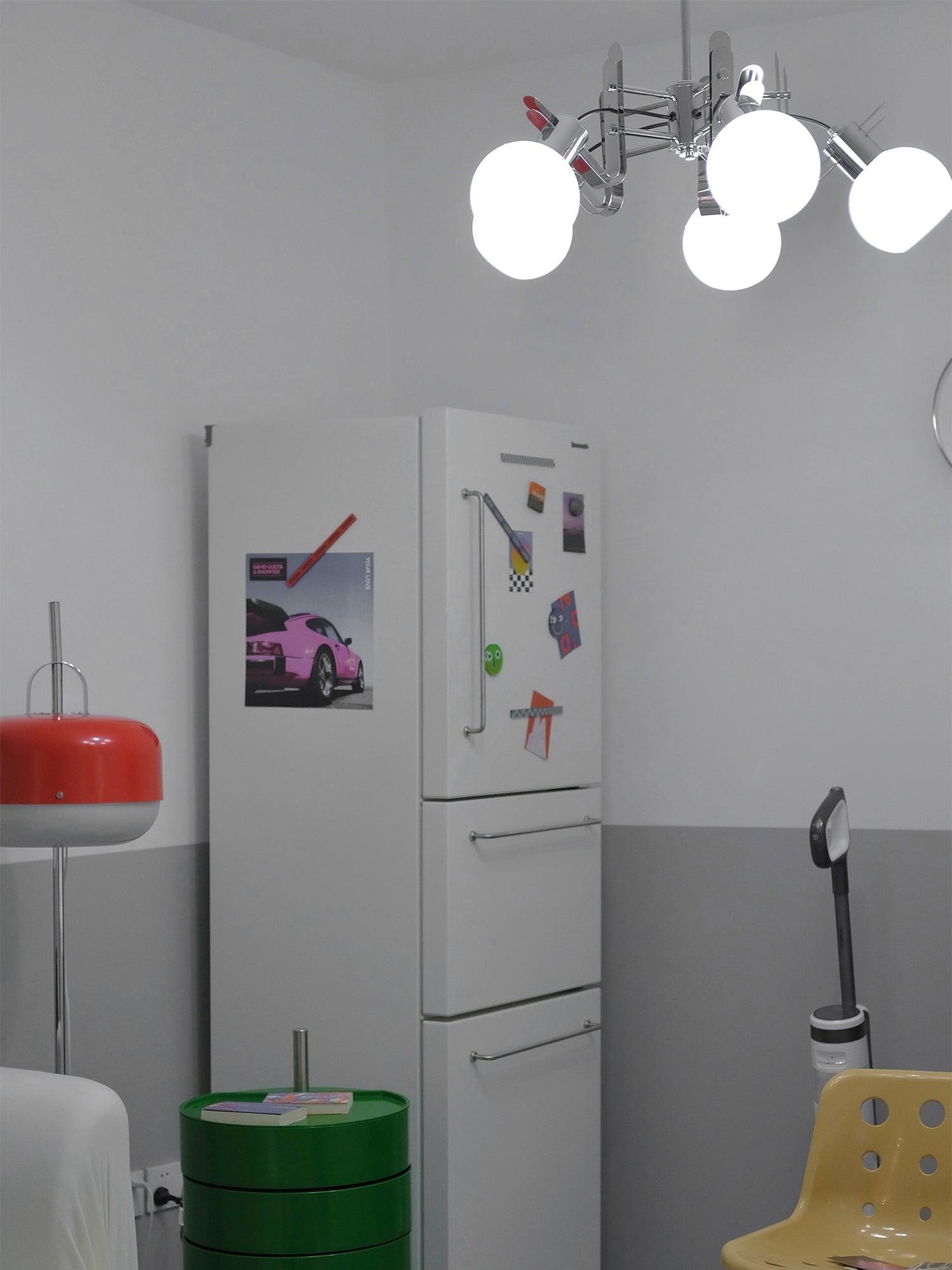 這種美麗的燈光來自 70 年代的南斯拉夫。這款中世紀的現代吊燈由白色玻璃球組成。它點亮時會發出特殊的閃電。這盞枝形吊燈非常引人注目。