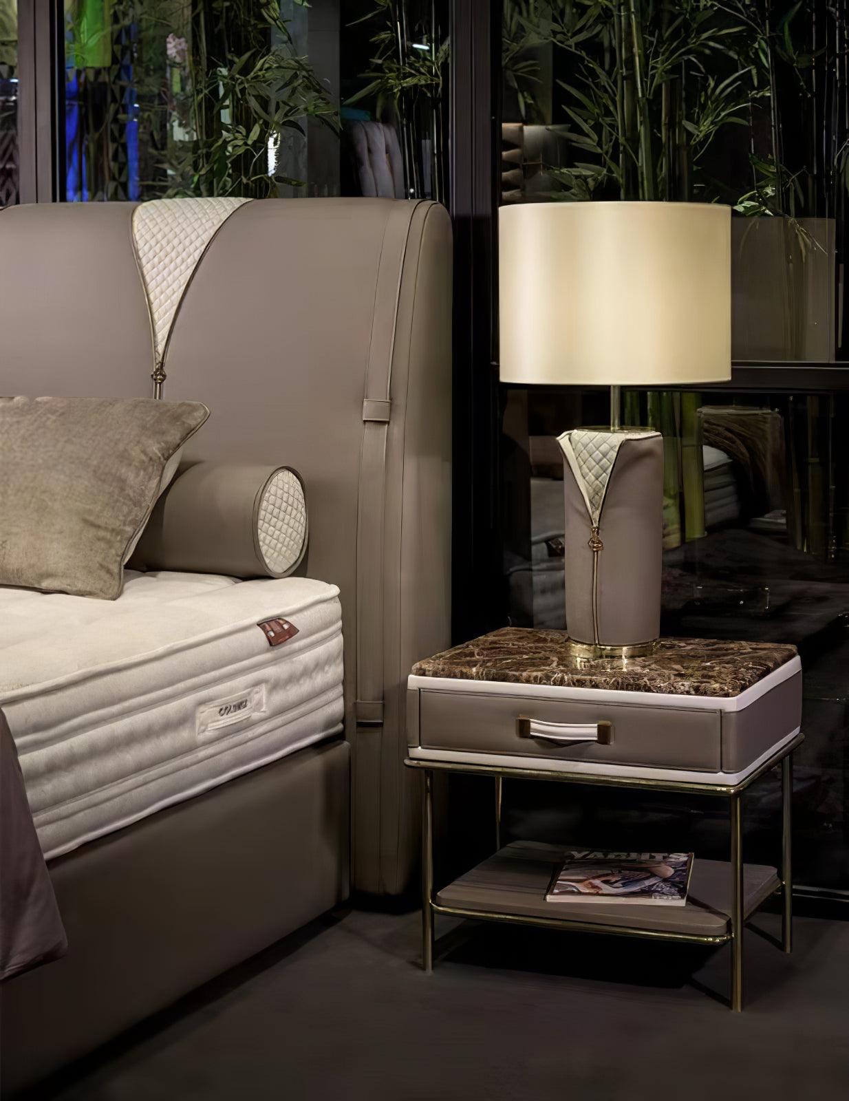 現代風格的 Bromyard 檯燈採用白色燈罩,突出了燈體的混合材料:金屬底座和灰色皮革飾面,帶有明亮的開槽金色燈頸。用這款灰色檯燈為任何家庭房間或客廳帶來時尚照明。