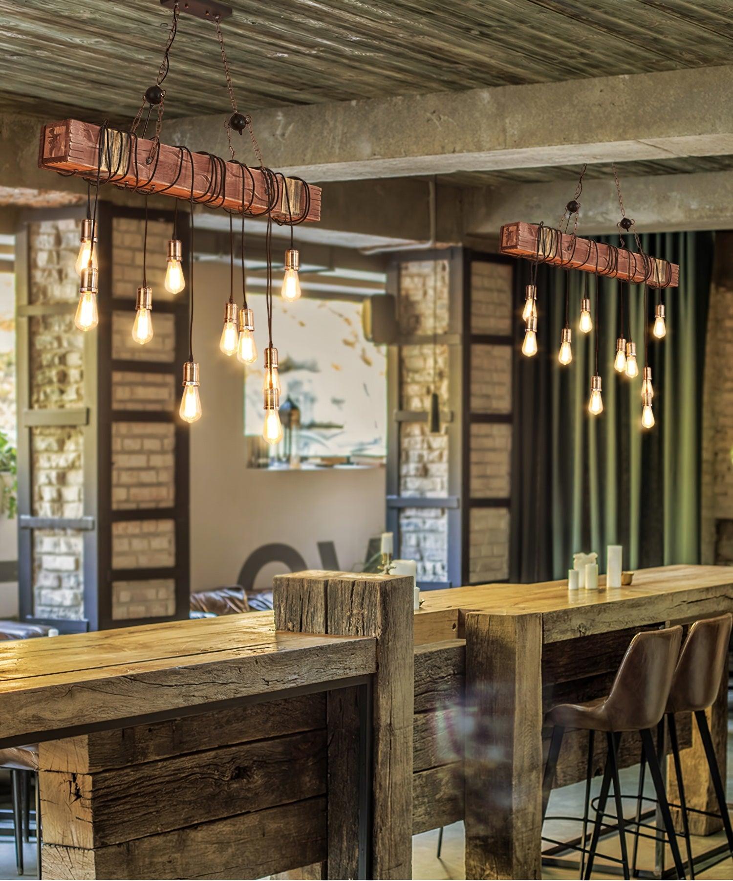 用這款 10 燈島形吊燈為家居室內營造一種質樸優雅的感覺。懷舊的愛迪生燈泡環繞在深色再生木樑周圍,創造了這款傑作。帶有鏈條的生鏽圓形鐵球將燈具固定在矩形頂篷上,為該設計增添了帥氣的精緻和優雅。在廚房島台、餐桌和台球桌上或客廳裡,它將賦予農舍魅力和鄉村風格。