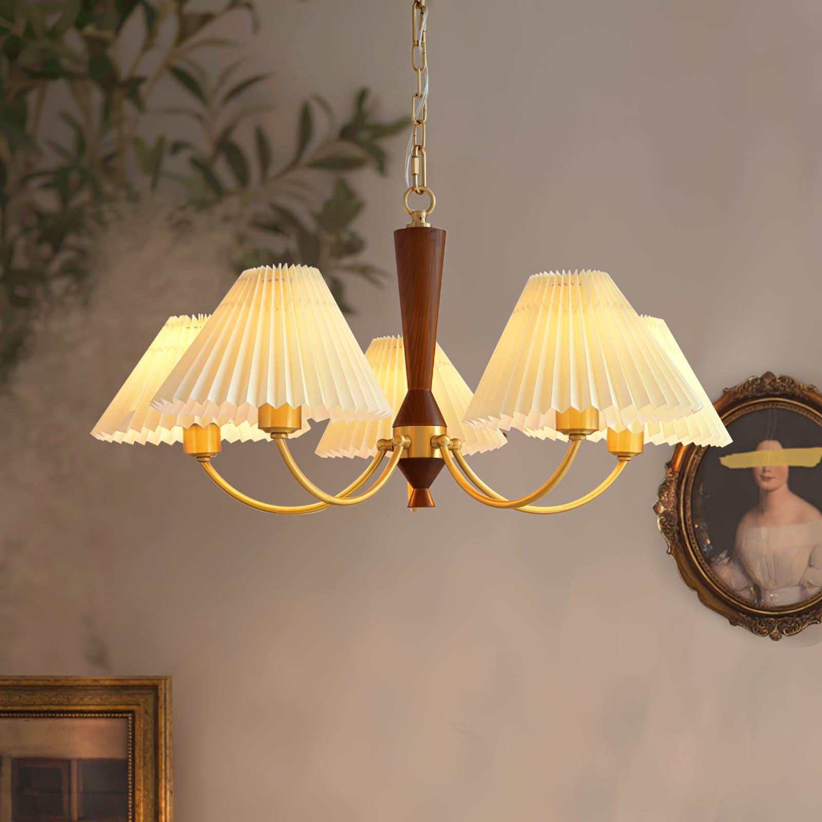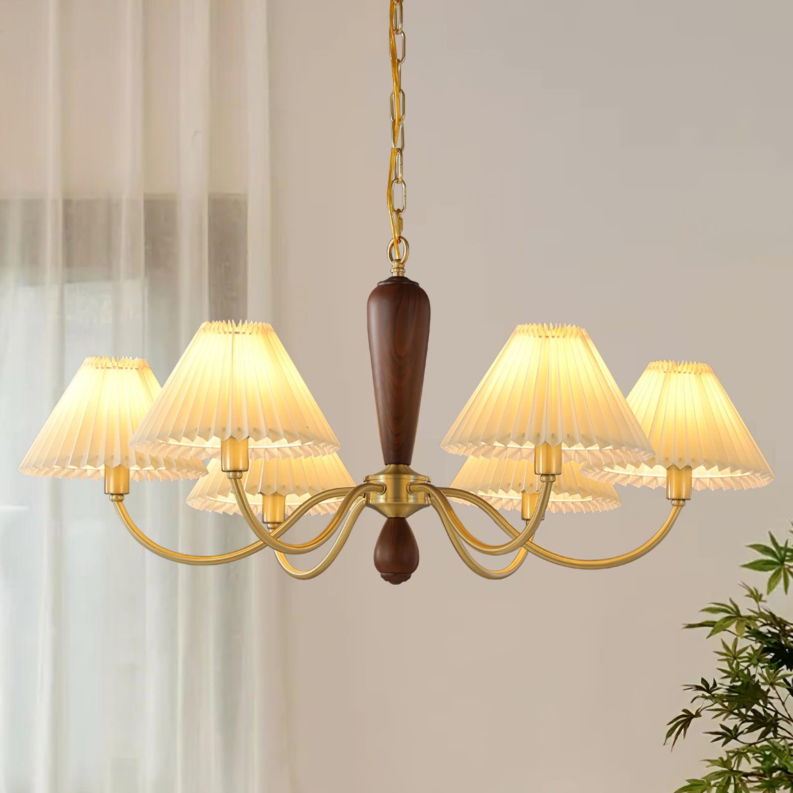 這款枝形吊燈以其弧形燈臂和簡約細節的時尚設計給人留下深刻印象。白色的褶皺燈罩巧妙地襯托出整體畫面。