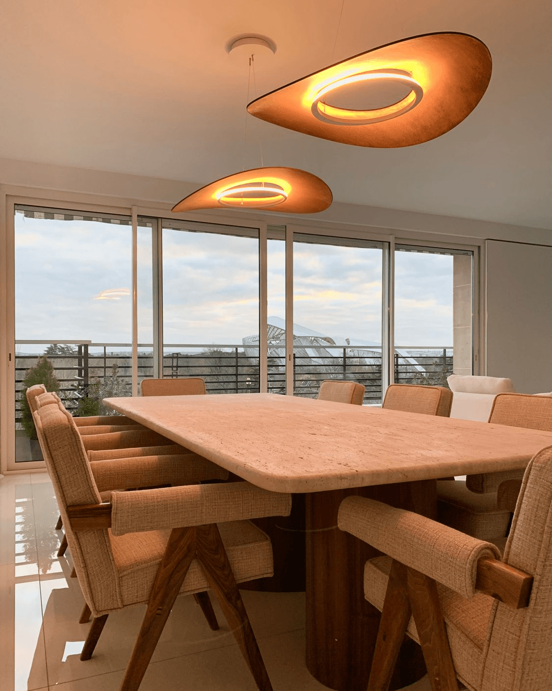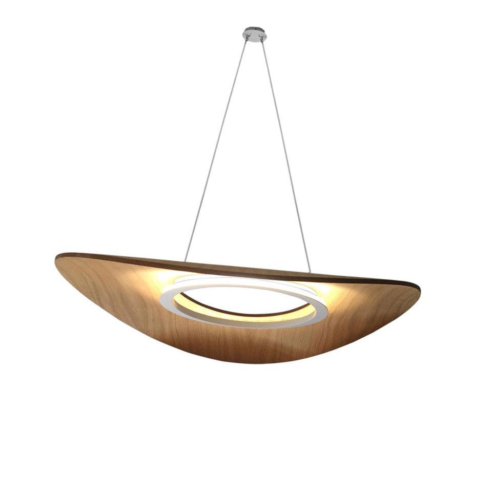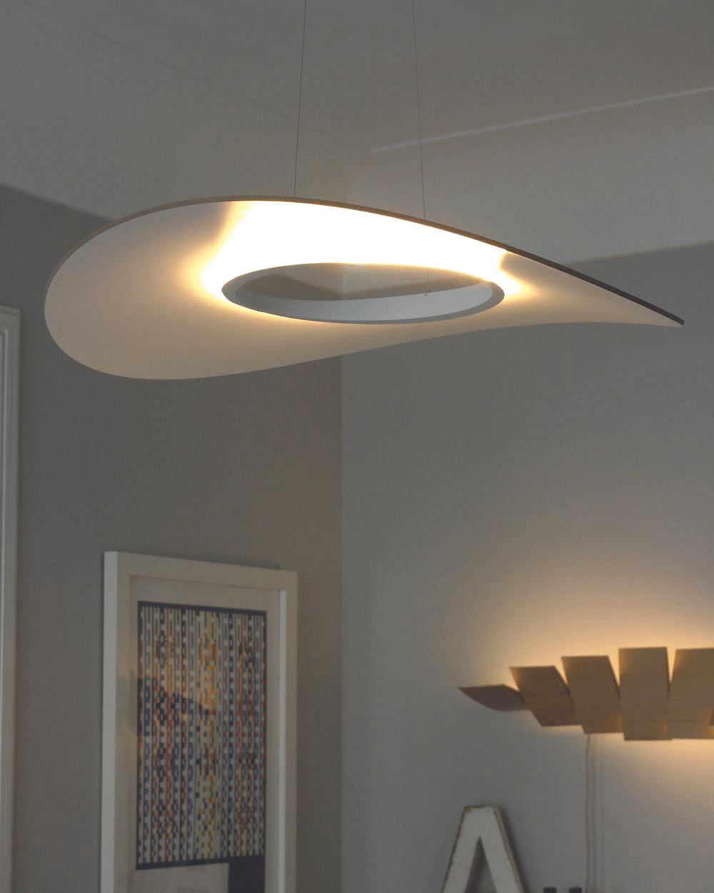 X-flr6 是一款帶間接照明的吊燈。不對稱的 _X-flr6 根據其方向呈現不同的形狀。 _X-flr6 由懸掛它的電纜提供動力,就像一個不明飛行物,漂浮在空中。